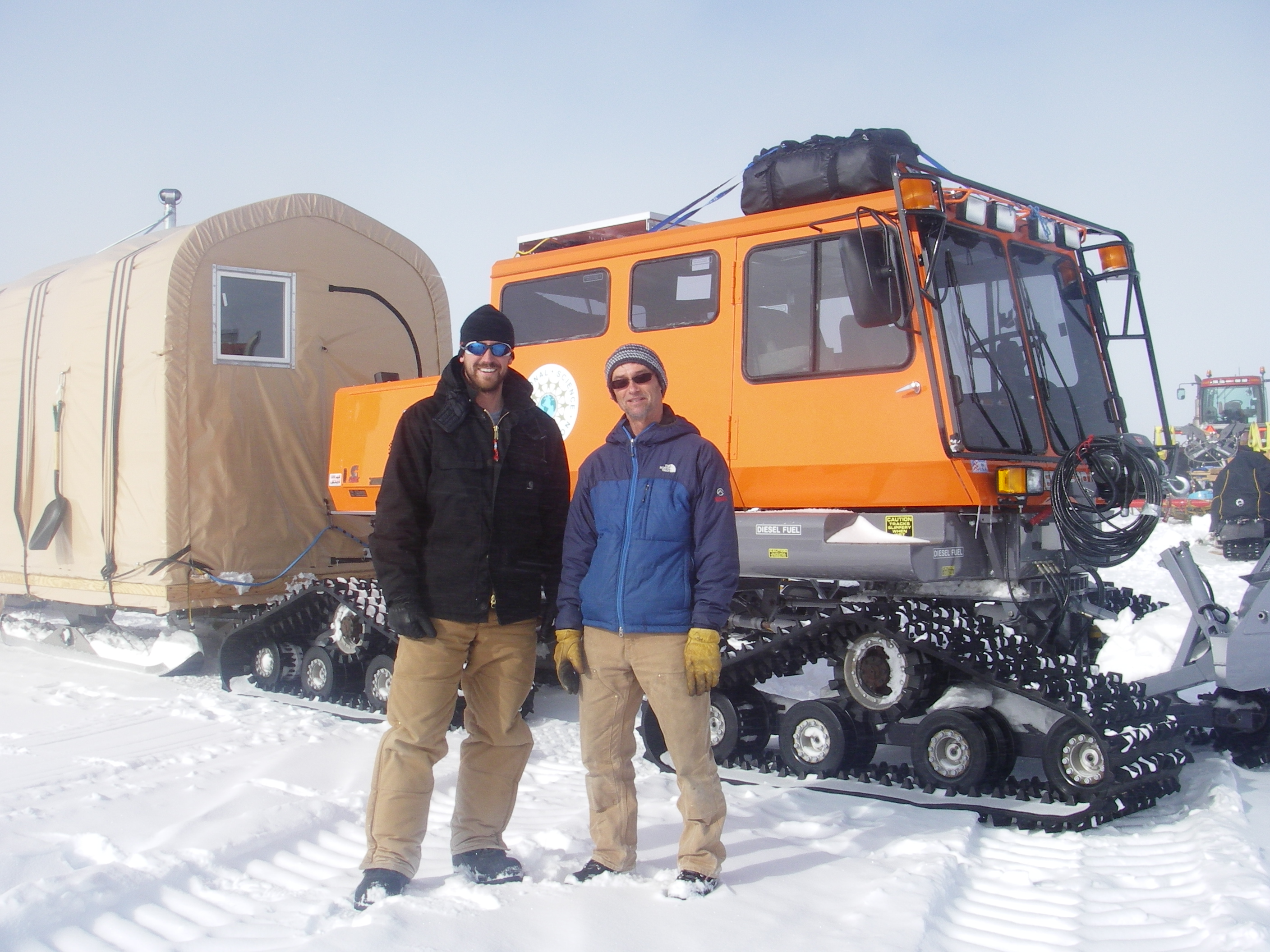 Pat Smith and Craig Beals, both of Billings, MT, pose in front of the Tucker snow machine and the traverse's "Kitchen on Skis". The two had never met before but immediately found common ground in their common roots. Summit Camp, Greenland.