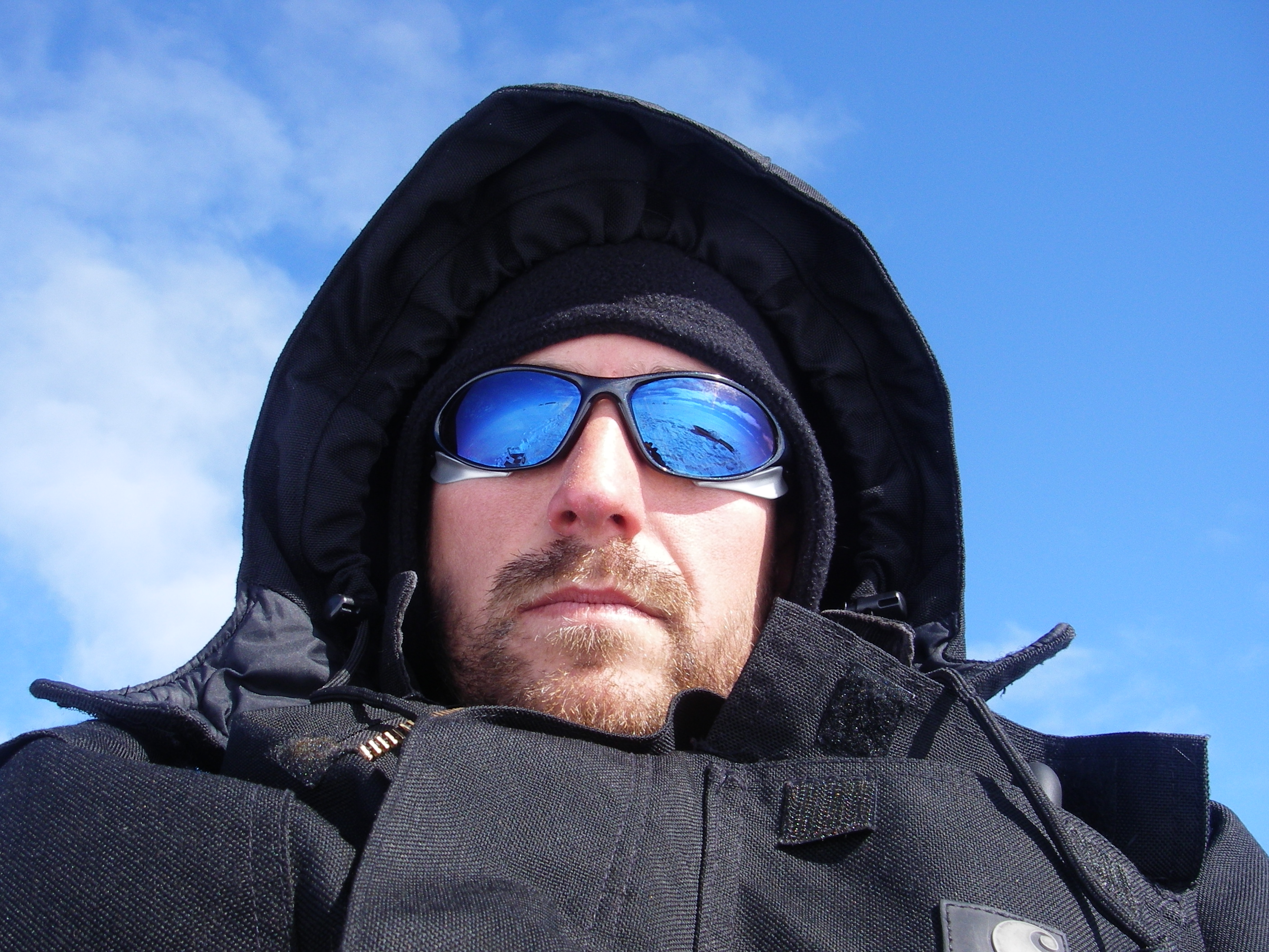 Modeling the latest fashions in extreme cold weather gear, Craig Beals attempts to fight off the cold weather with layers and layers and layers. Balloon Island, Greenland.