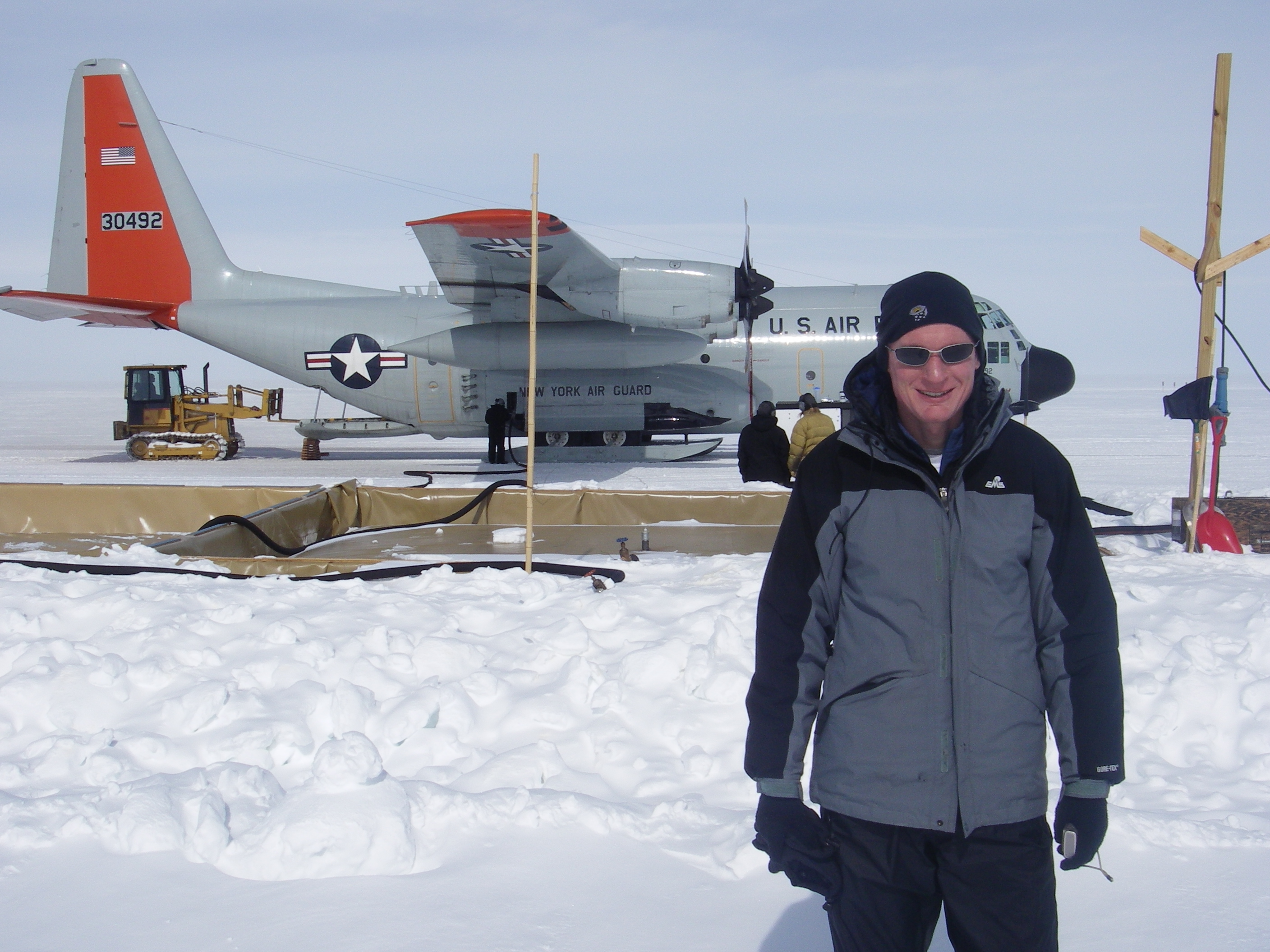 The C-130 Hercules with skis is the major mode of transport for cargo and people to remote arctic places like Summit Camp, Greenland. Here, Barry Lefer bids farewell to some of the crew as they head home.