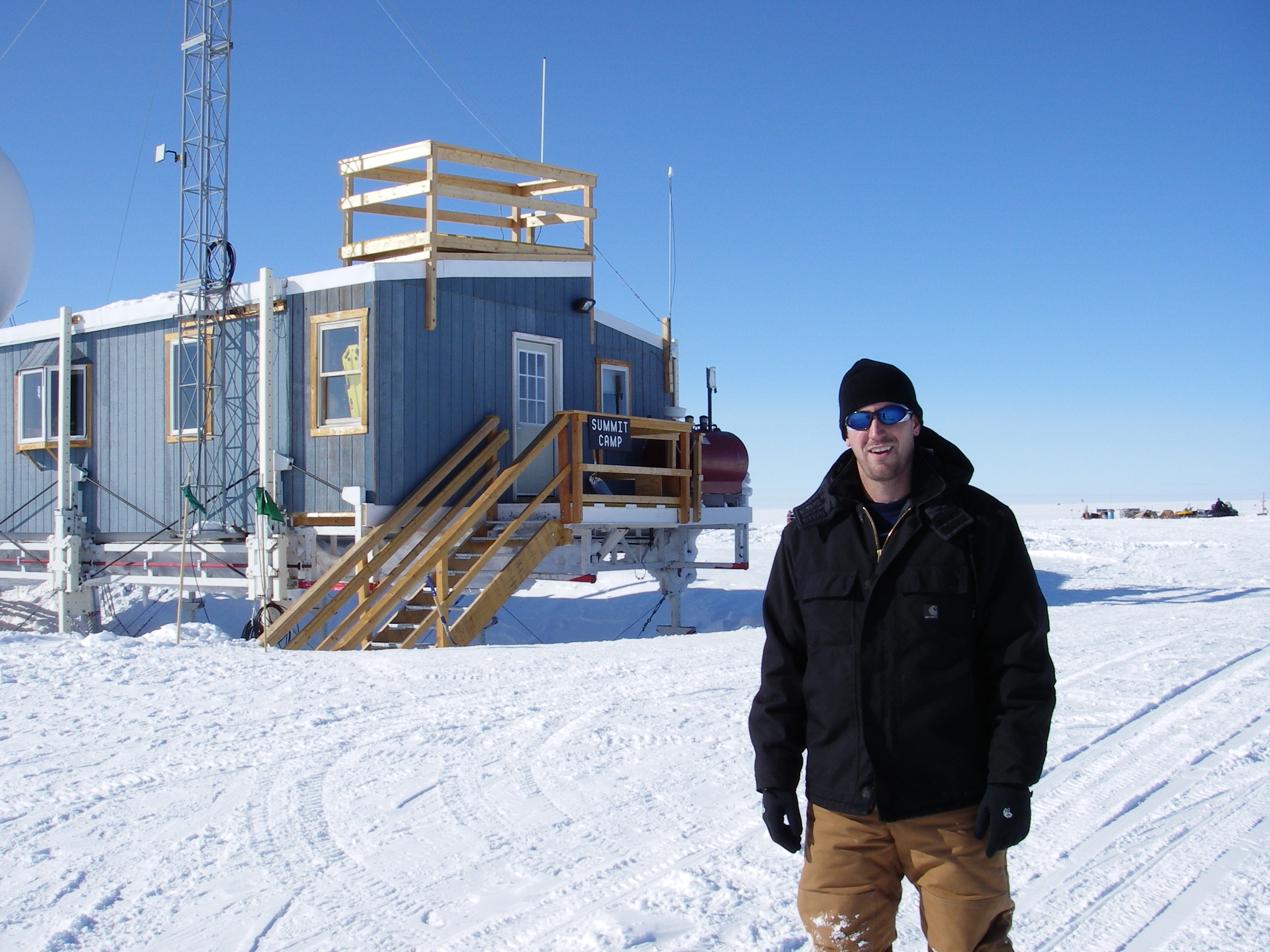 Craig Beals stands in front of the Big House on his first day at Summit Camp. The Big House contains the galley (kitchen) a large room for dining and is a place where people can go to relax. Atop the roof is a satellite dome that helps provide internet in this remote area of the world (not visible in photo). Summit Camp, Greenland.
