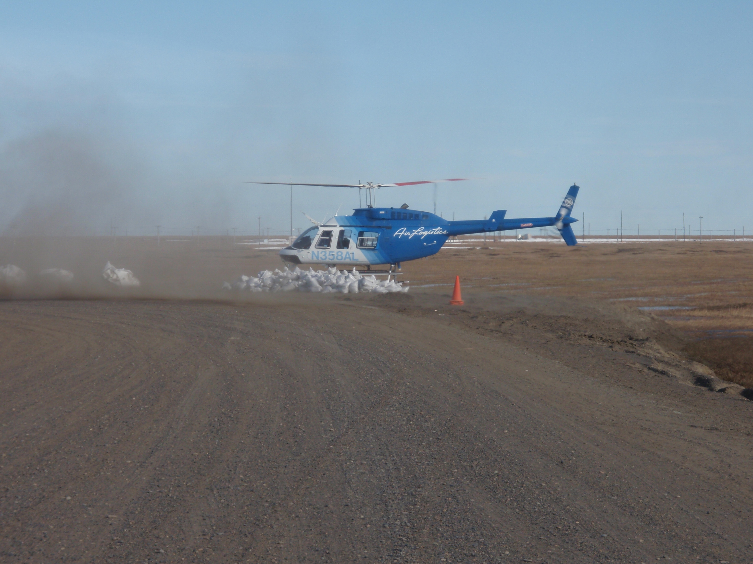 The helicopter collects bags of sand to carry to the dam. At the Barrow Environmental Observatory (BEO) field site near Barrow, Alaska.