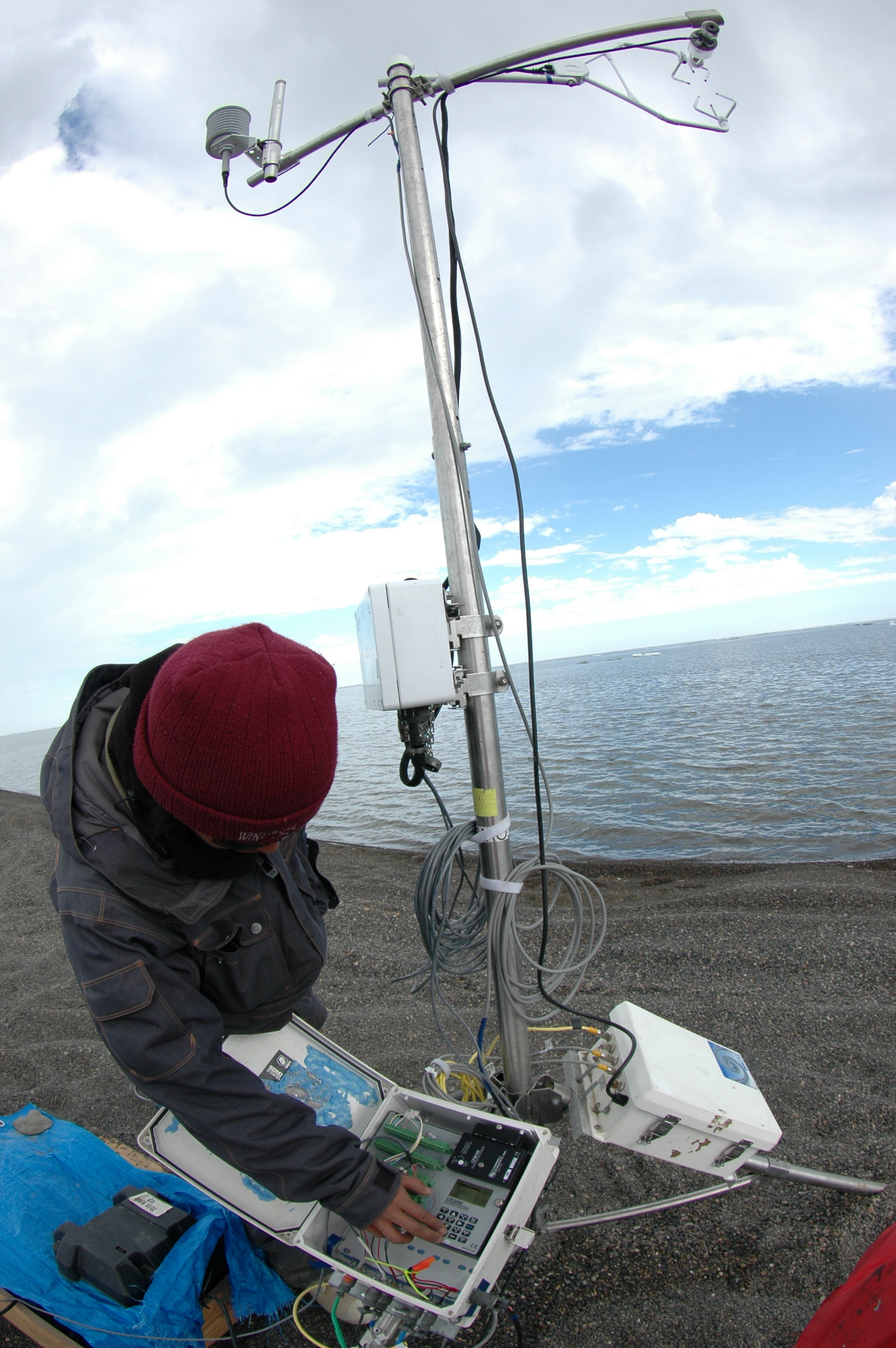 Hiroki Ikawa visits his instrument to make sure that it doesn't blow into the ocean on a daily basis. He also checks machinery to make certain it is working. Point Barrow, Alaska.