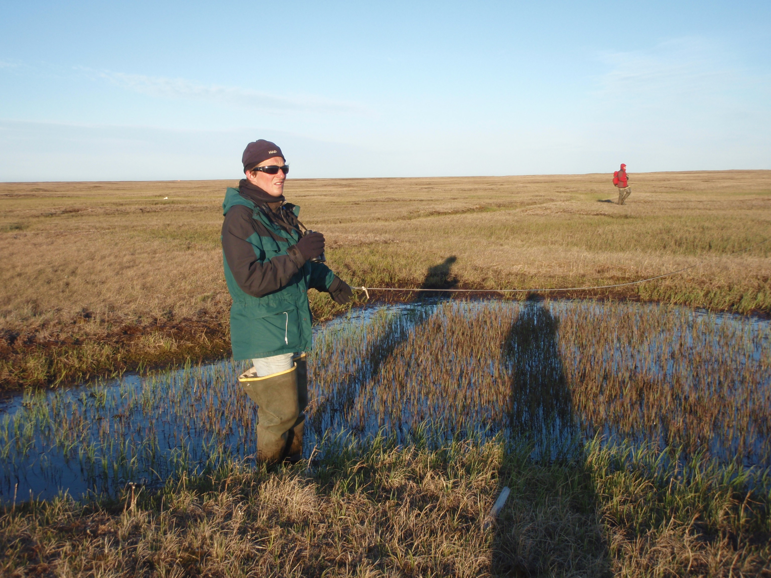 Holger Scheilzeth, of the Max Planck Institute for Ornithology in Seewiesen, Germany, is holding one end of the 100 meter rope that is being dragged across the tundra. The rope is used to mark the area walked, and to flush birds. At the Barrow Alaska Research Center (BARC) in Barrow, Alaska.
