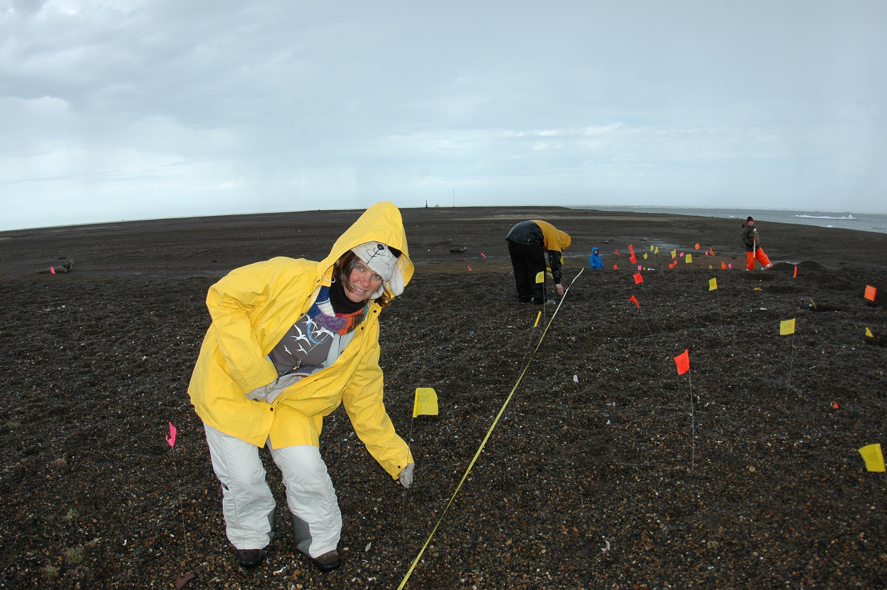 The team is creating grids so they can later dig holes at the site of a Nuvuk village. Point Barrow, Alaska.