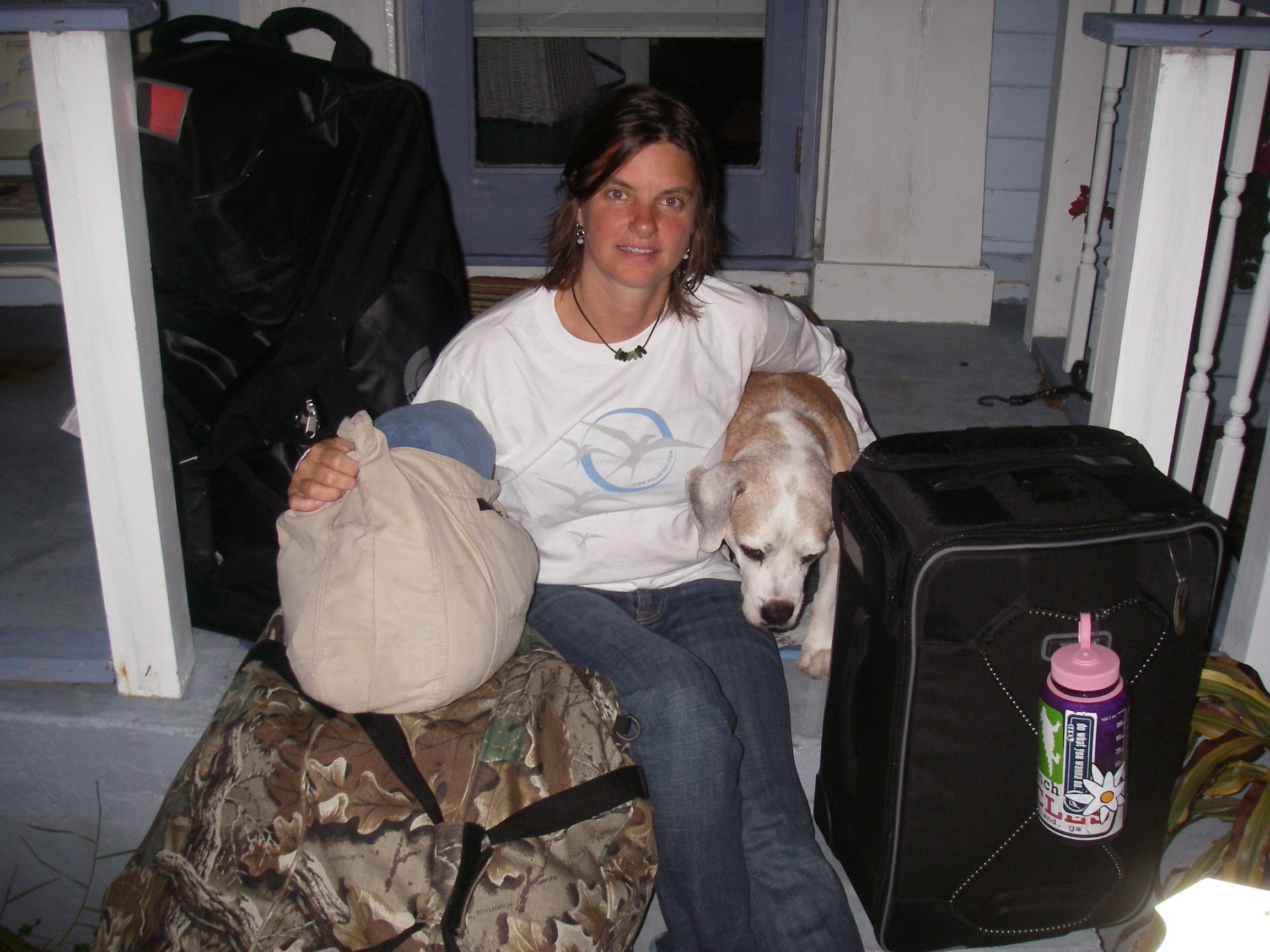 Elizabeth Eubanks says, "5:30am on June 10, 2008, ready to go. Hooch thinks he is going too!" Front porch of Elizabeth Eubanks' house in Lake Worth, Florida.
