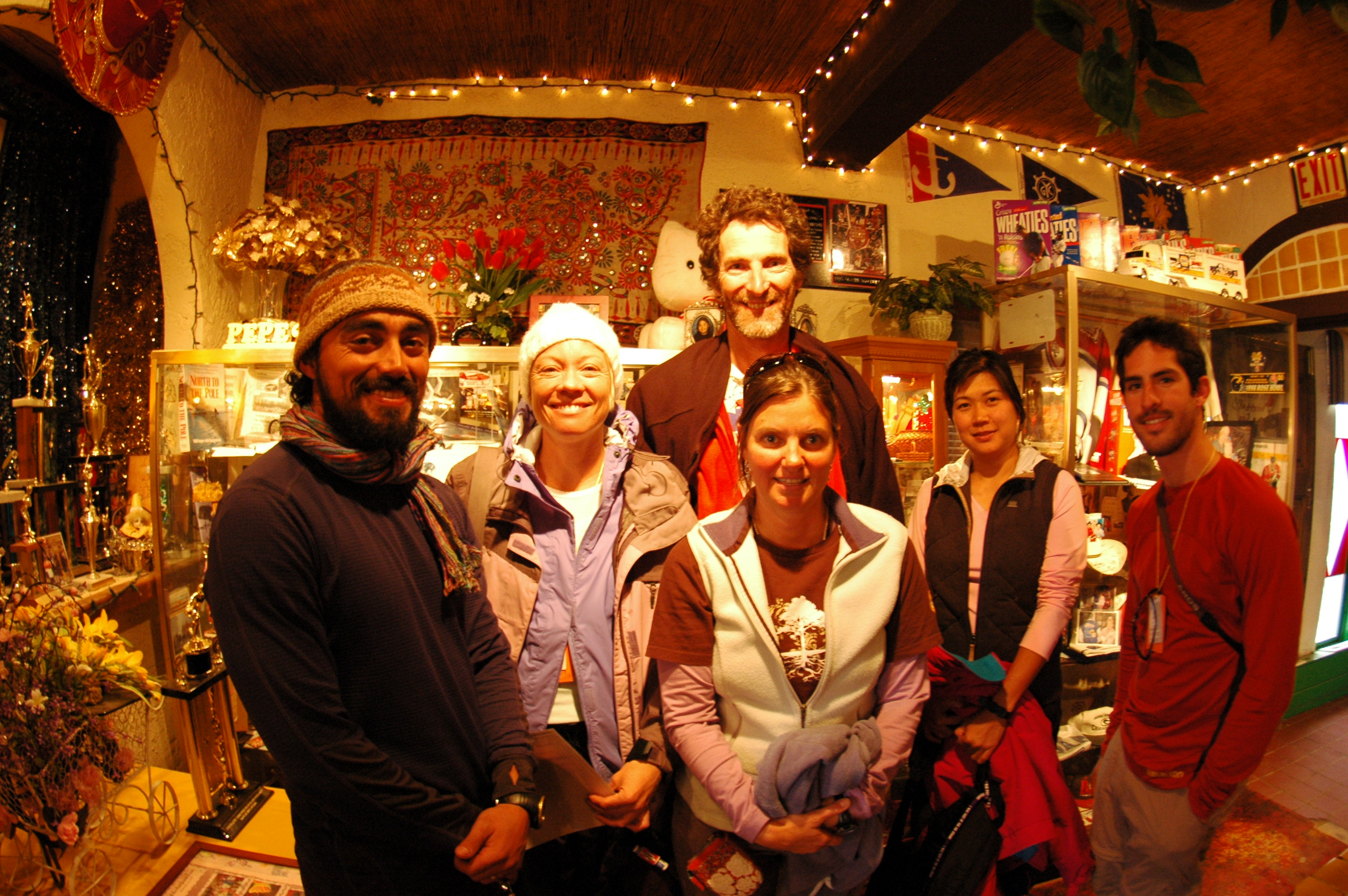 Left to right: Paulo Olivas, Kim Miller, Elizabeth Eubanks, Dr. Steve Oberbauer, Sandee Apang, and Jose Luciani. Pepe's Mexican Resturaunt in Barrow, Alaska.