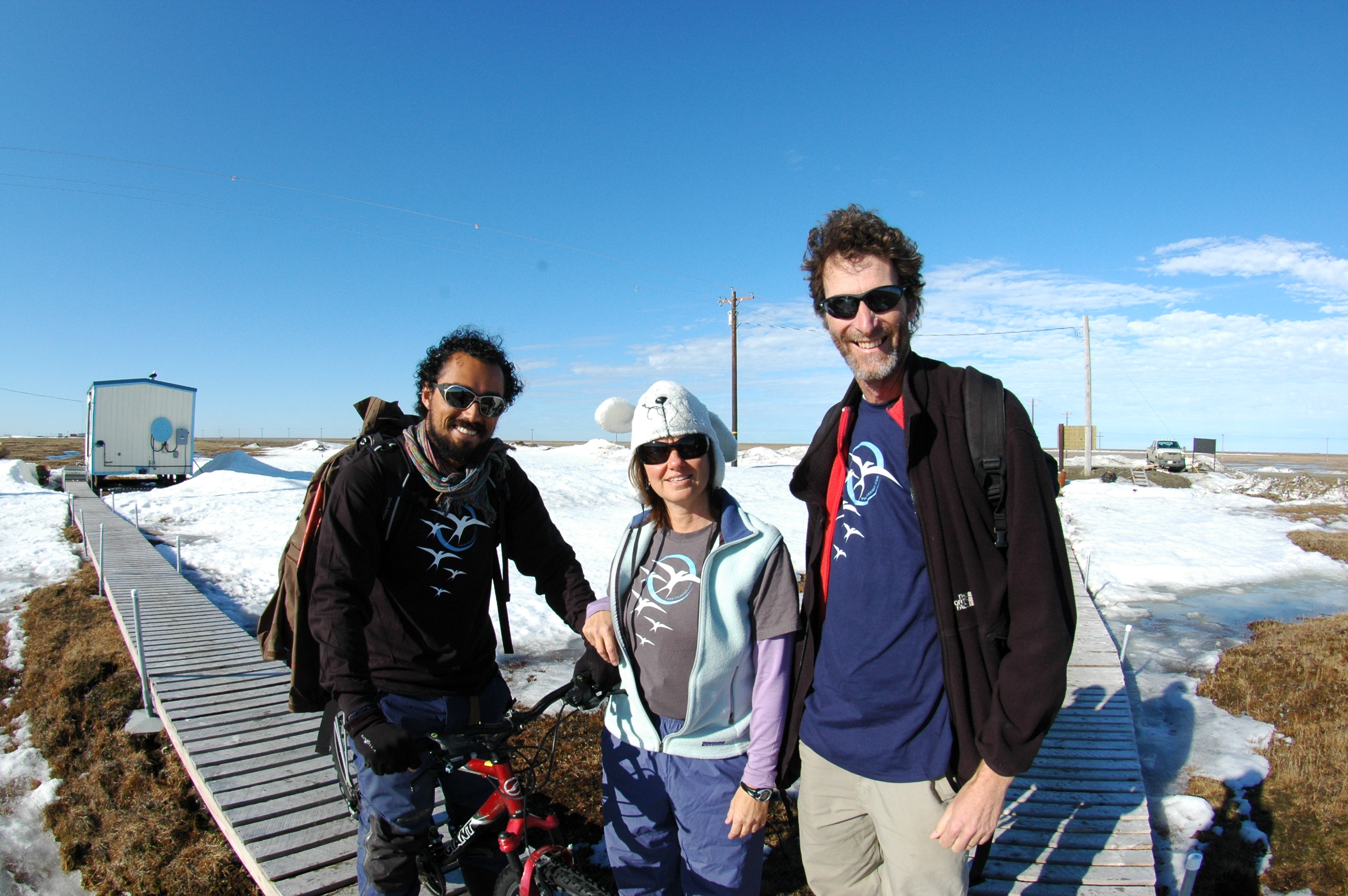 Paulo Olivas, Elizabeth Eubanks, and Dr. Steve Oberbauer preparing to walk the field site. At the Barrow Environmental Observatory (BEO) field site near Barrow, Alaska.