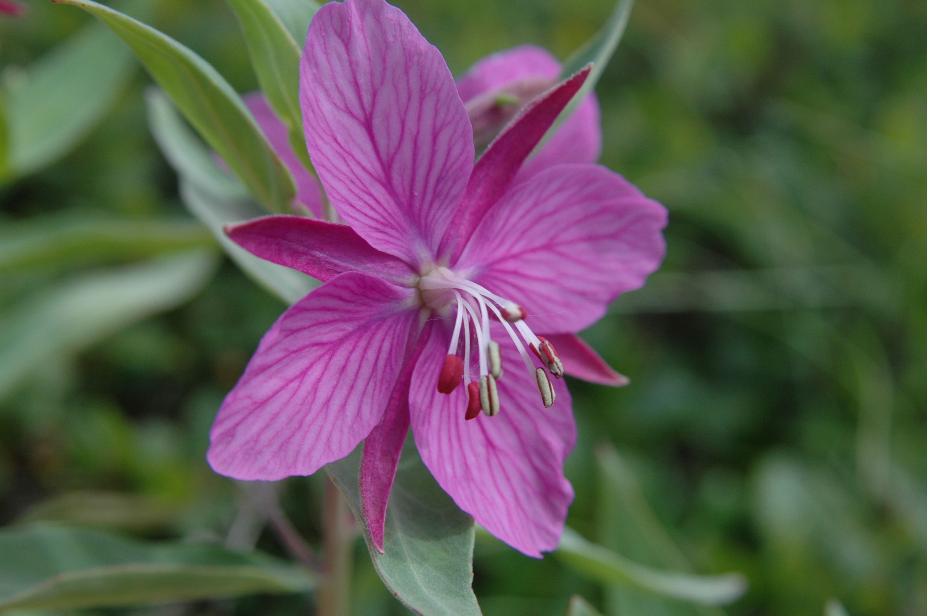 River Beauty, also known as Dwarf Fireweed. As an herb, fireweeds are a source of nutrients, particularly in the early spring. The early, tender shoots contains vitamins A and C and are edible raw or lightly steamed. Leaves and flowers can be used as a tea. It may have a laxative effect -- use in moderation. Kodiak, Alaska.