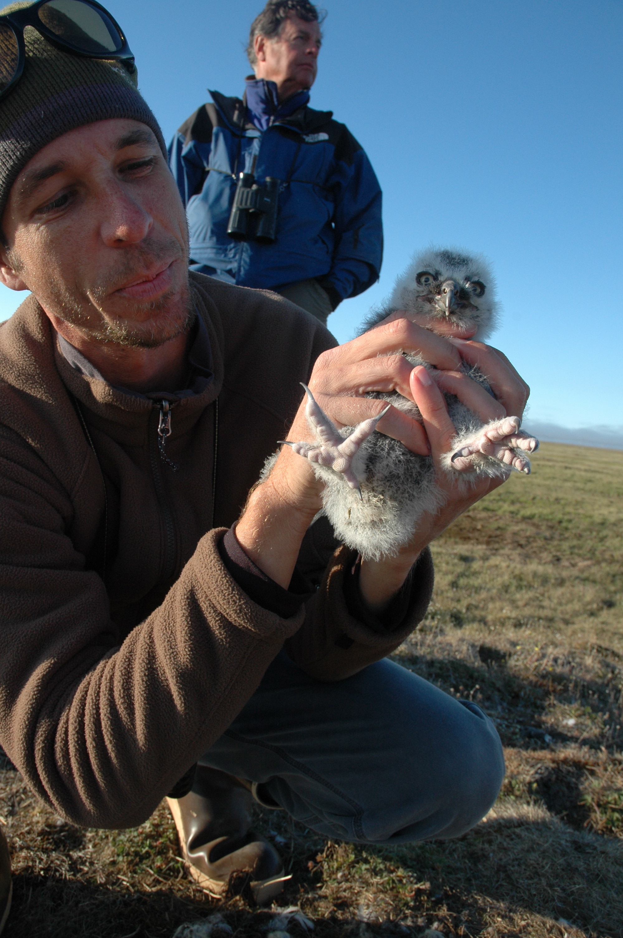 Rob Eubanks with a Snowy Owl chick. Barrow, Alaska.