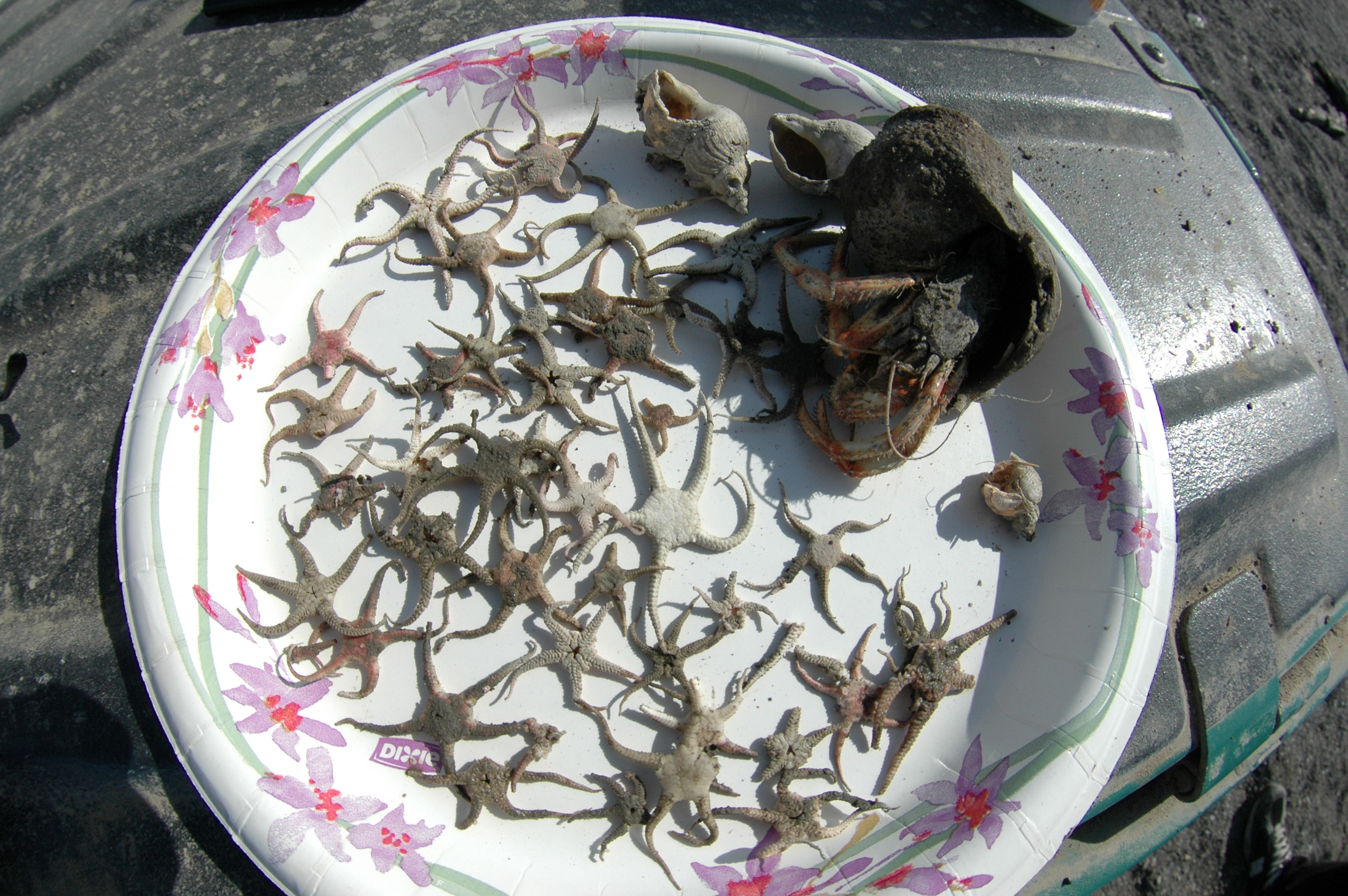 Brittle sea stars and hermit crabs found by some beach combers in Barrow, Alaska.