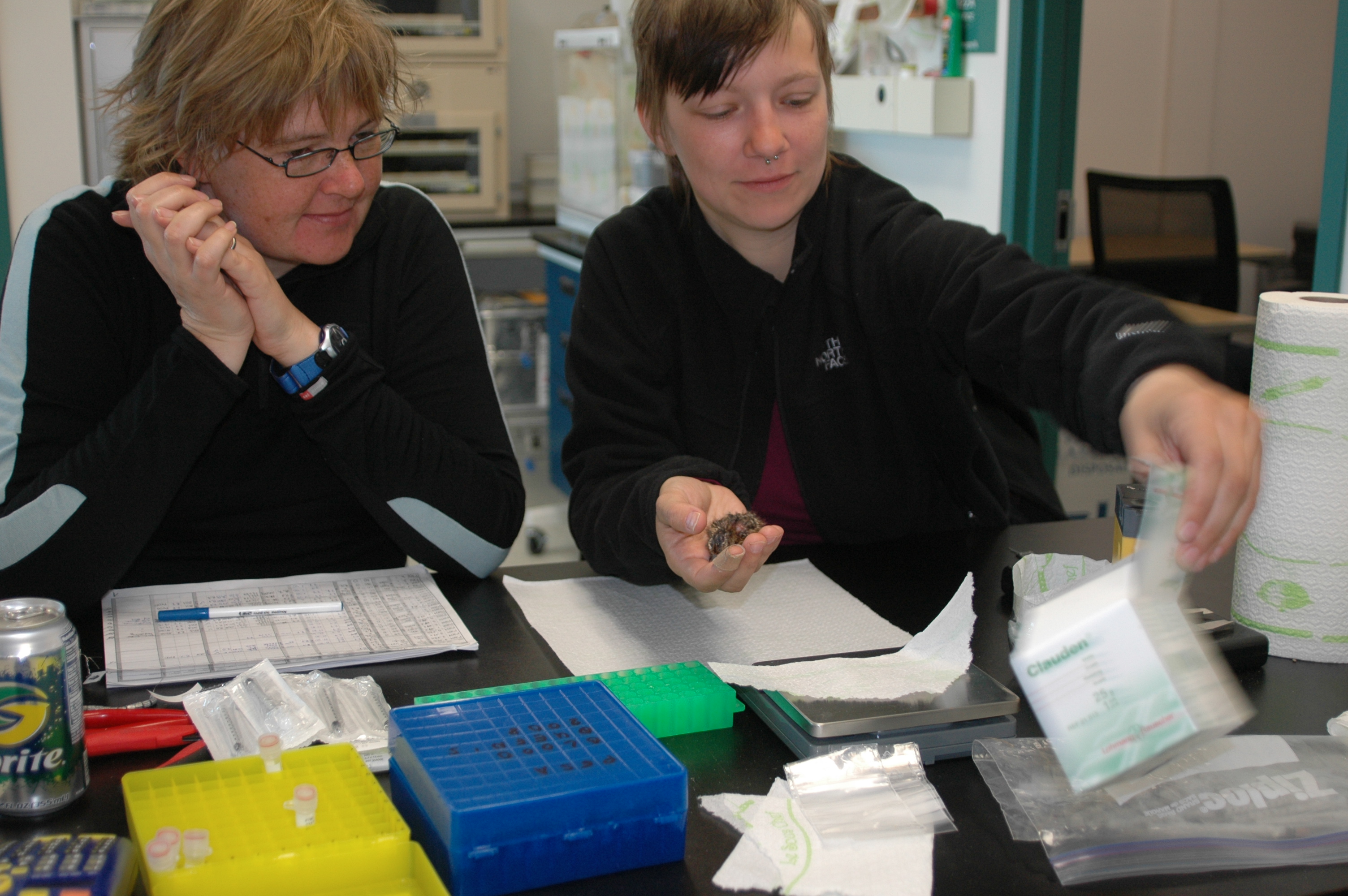 Sylvia Kuhn and Katja Temnow of Max Planck Institute for Ornithology in Seewiesen, Germany, record baby Pectoral Sandpiper data. At the Barrow Alaska Research Center (BARC) in Barrow, Alaska.
