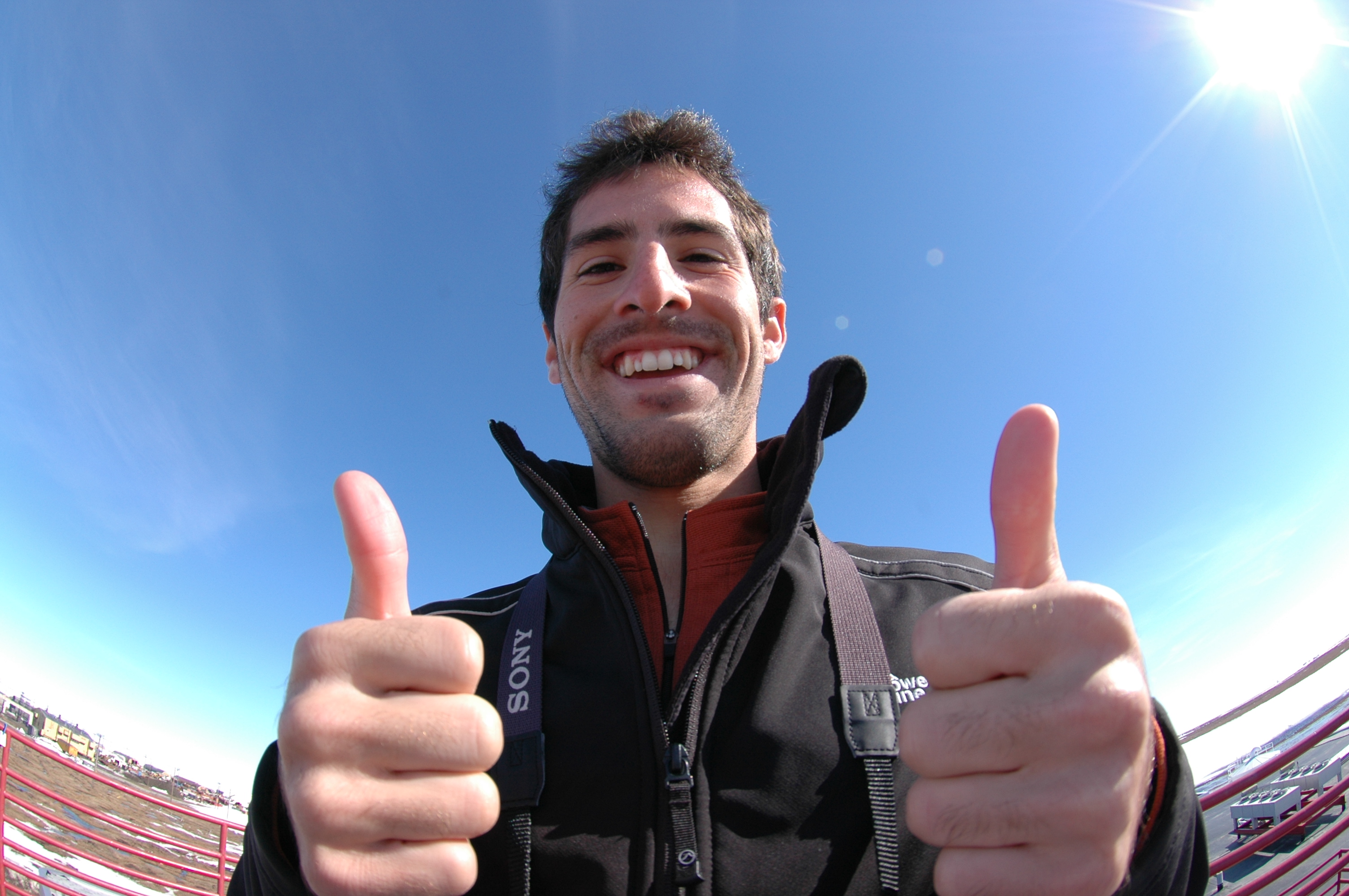 Jose Luciani gives two thumbs up on top of the Barrow Global Climate Change Research Facility in Barrow, Alaska.