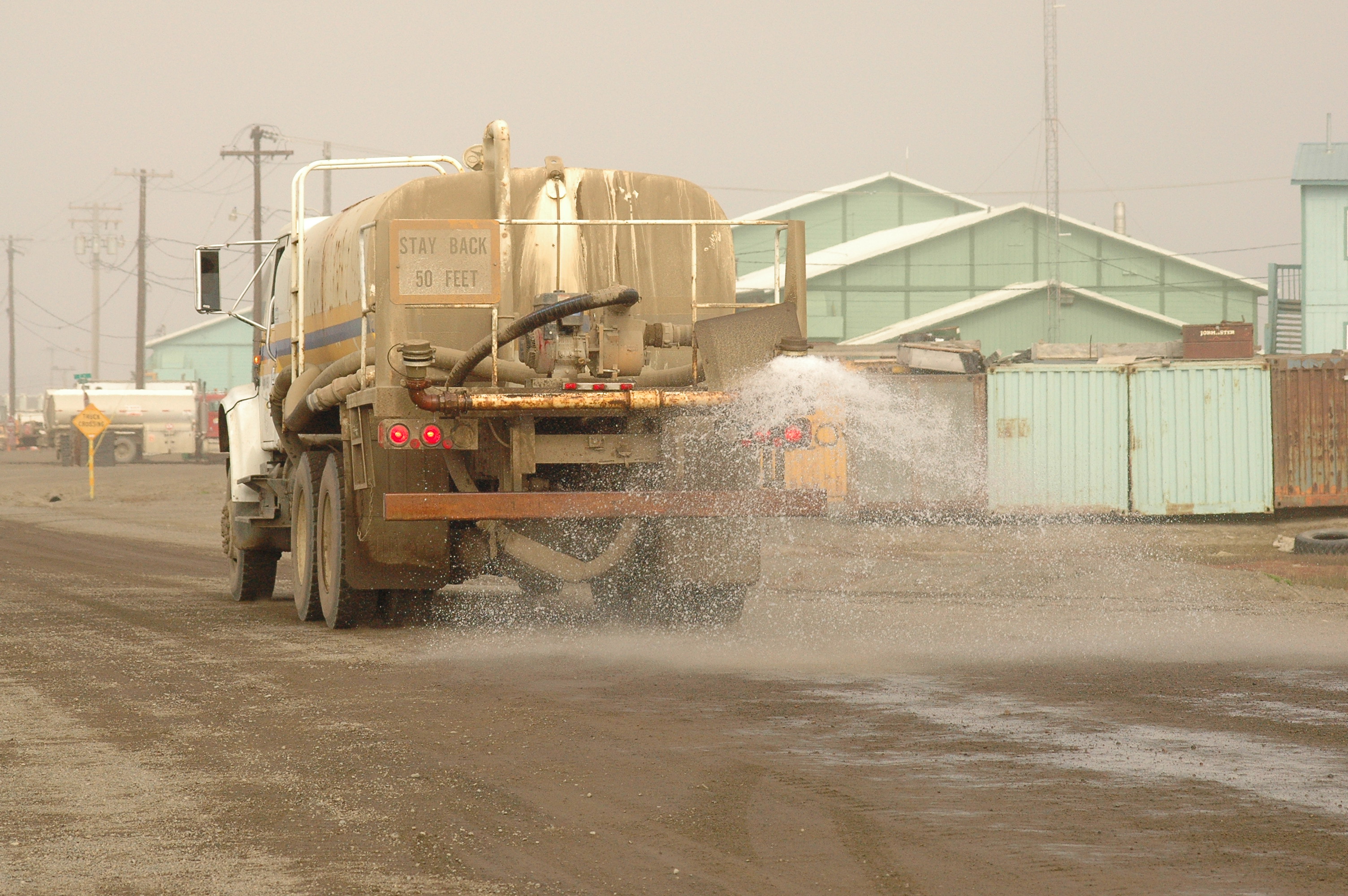 This is a comon sight around the roads of Barrow. The roads are very dry and dusty. The water keeps the roads from forming dust clouds when vehicles drive by. Barrow, Alaska.