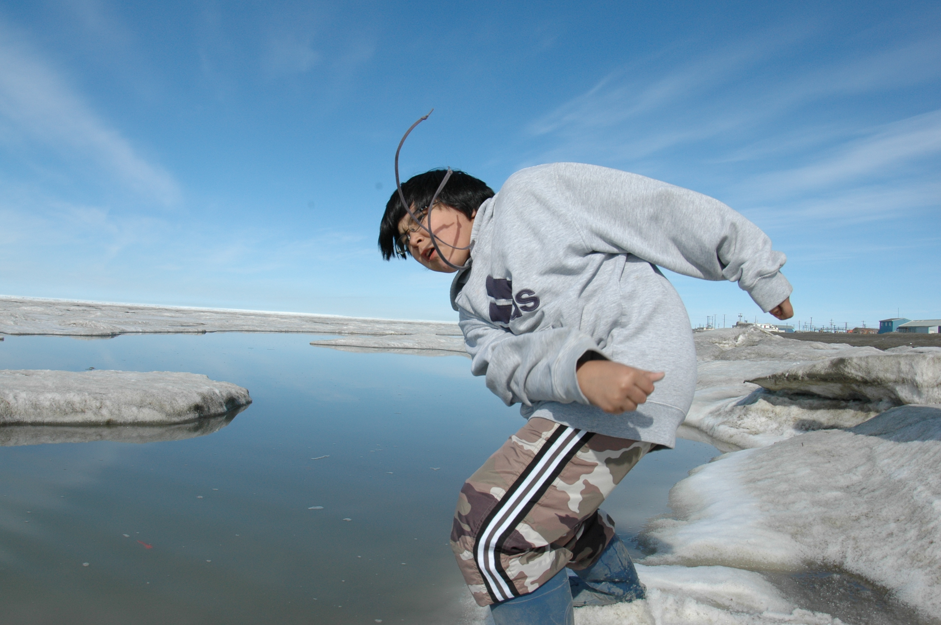 Past time on the Arctic Ocean, 6th grader Austin skips stones on a Saturday night. On the beach in Barrow, Alaska.