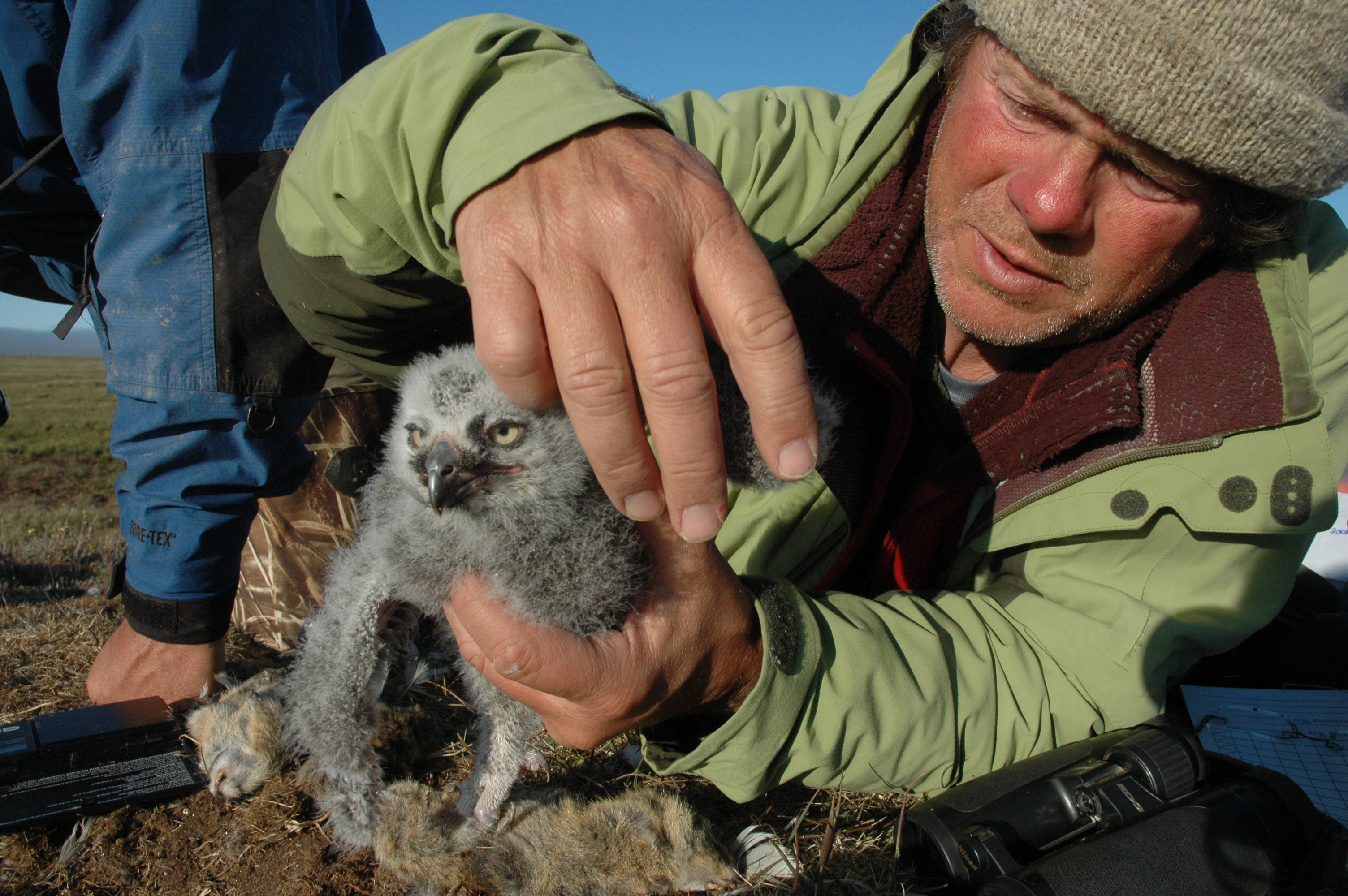 Denver Holt checks out a snowy owl chick to make sure that all of its limbs seem to work in the correct way. Denver records all of his observations about every chick at every nest he visits. Barrow, Alaska.