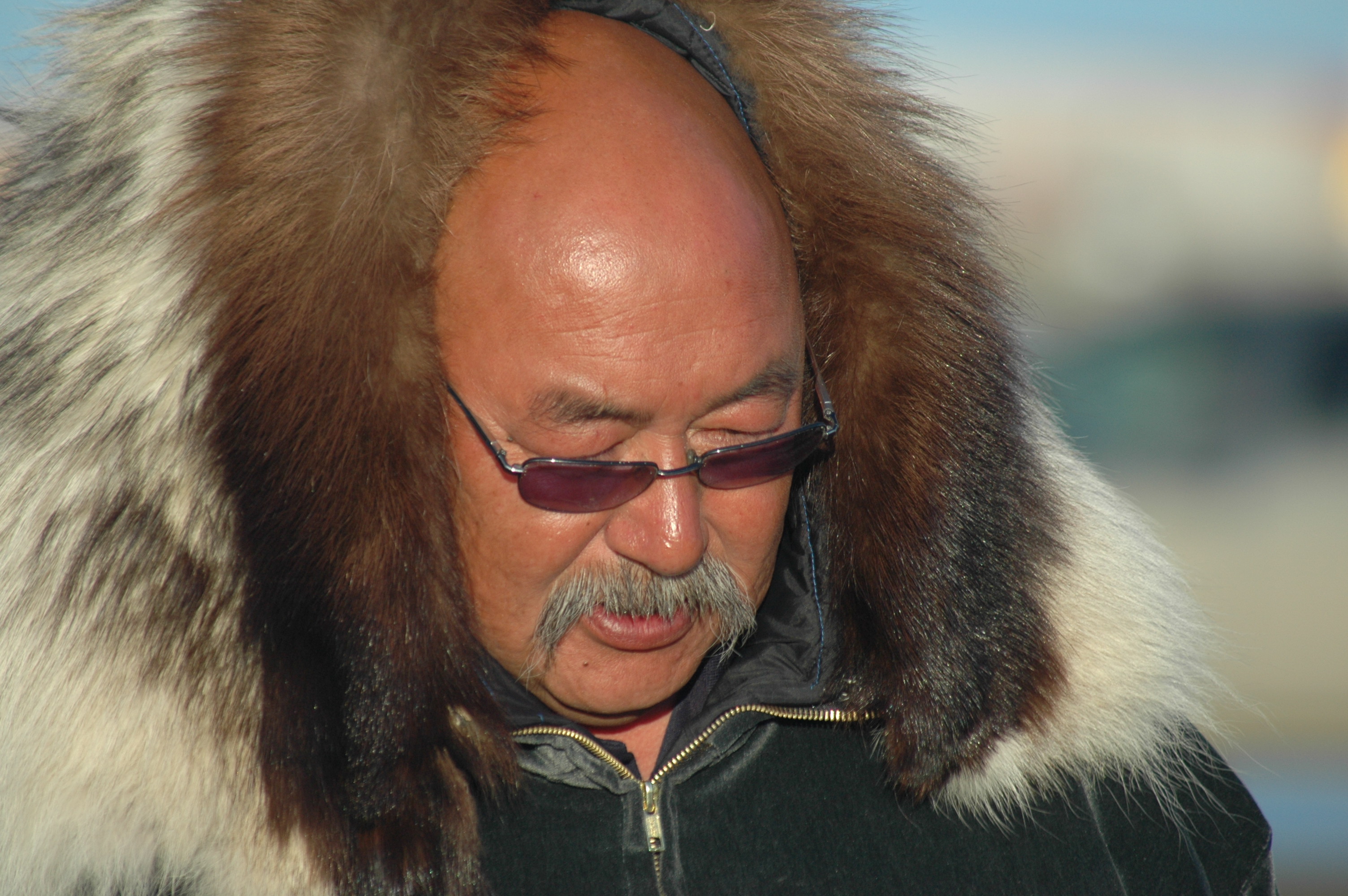 An elder celebrating with three whales. At the site of Nalukataq in Barrow, Alaska.