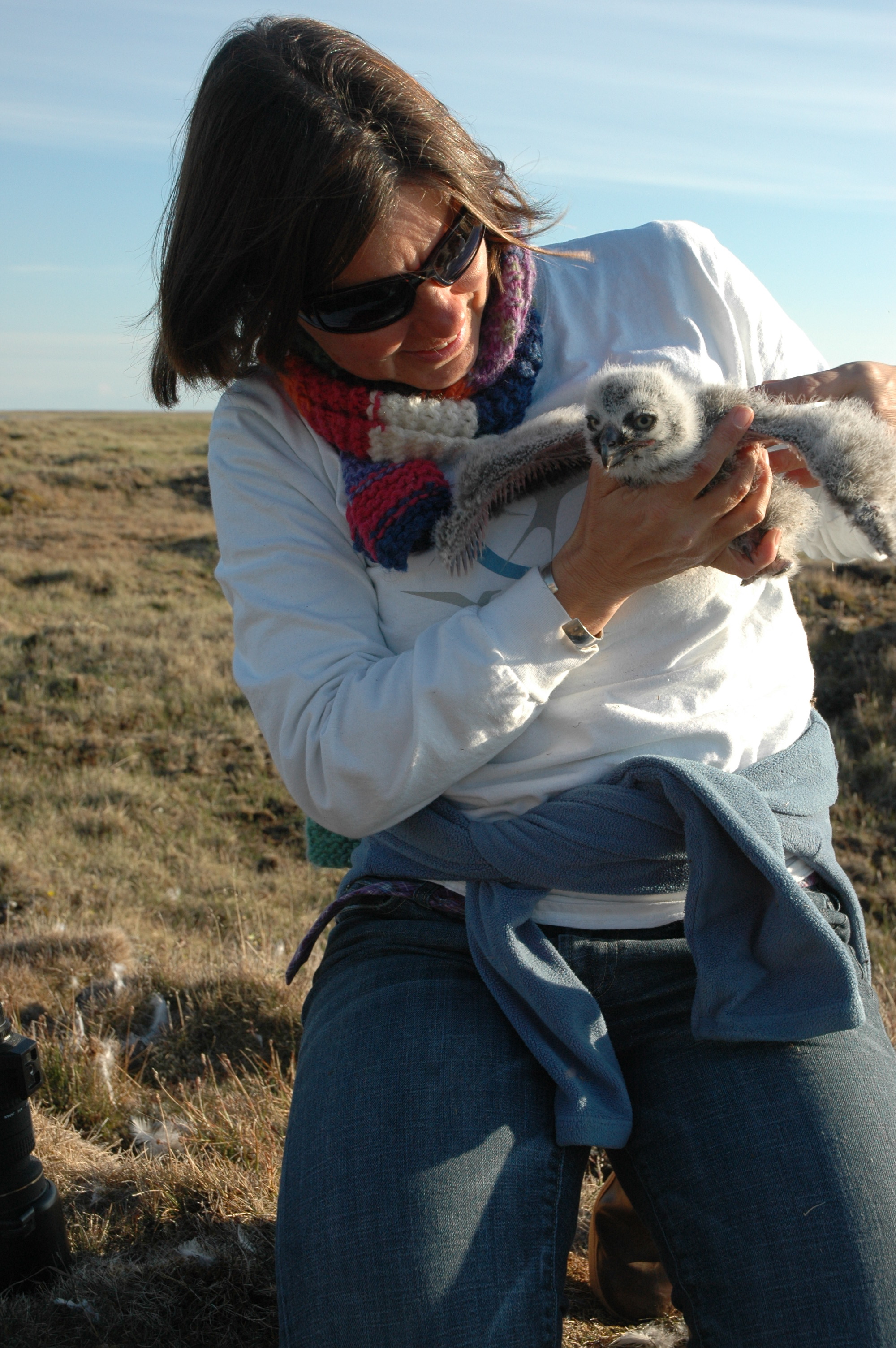 Elizabeth Eubanks holds a Snowy Owl chick in Barrow, Alaska.