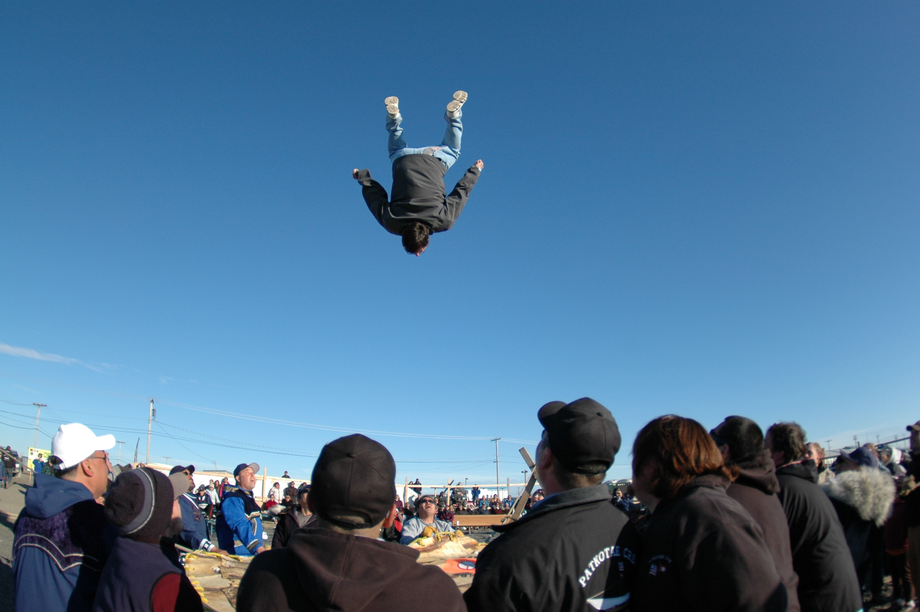 A man does an impressive flip on the blanket toss at the site of Nalukataq in Barrow, Alaska.