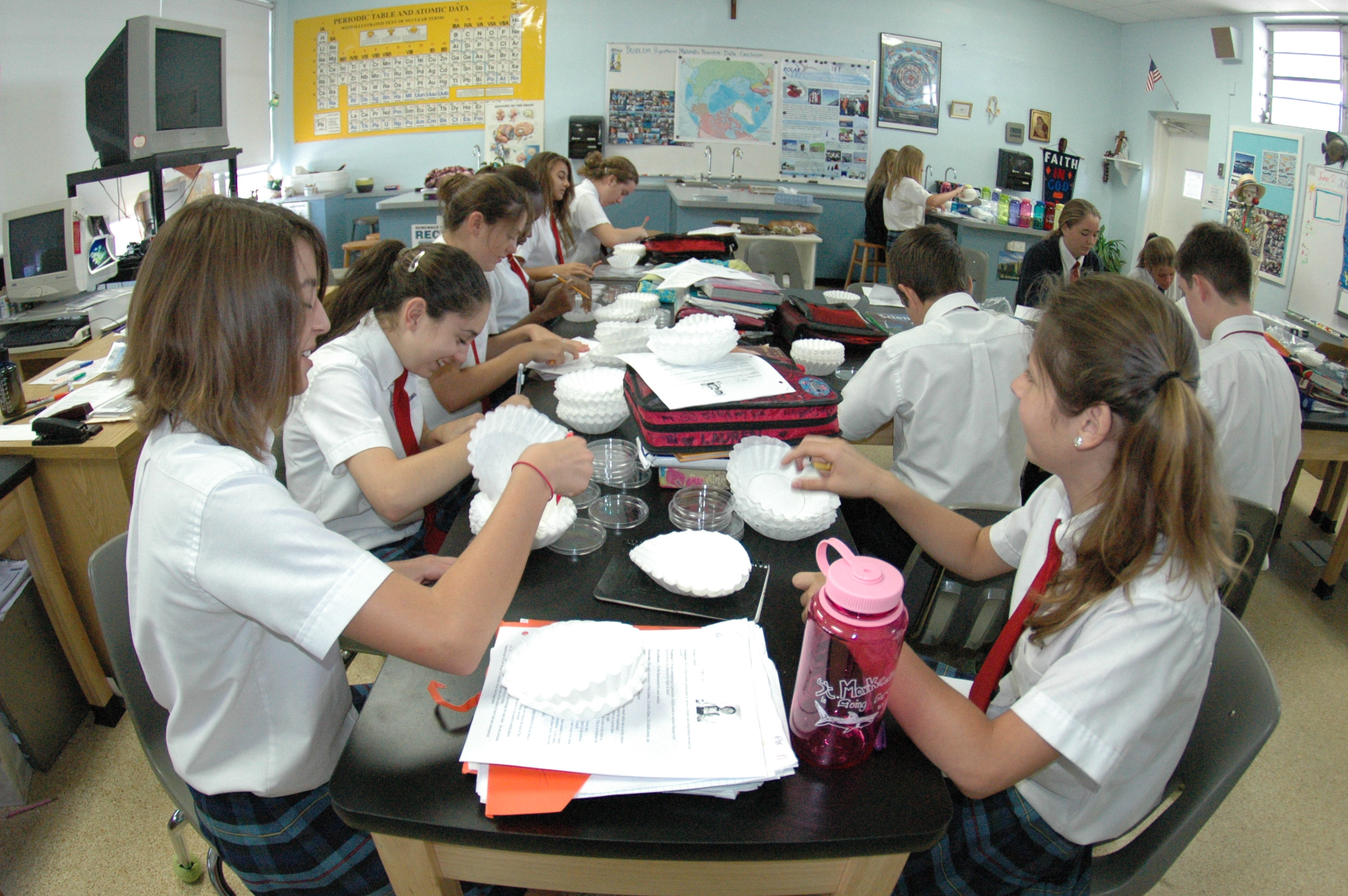 The Germinators are a group of future 8th graders who will be participating in The Alfalfa Germination Project. They will be adding notes to the Ask the Team section of Elizabeth Eubanks' website. Here they are labeling petri dishes, cutting coffee filters, and counting alfalfa seeds. At St. Mark Catholic School in Boynton Beach, Florida.