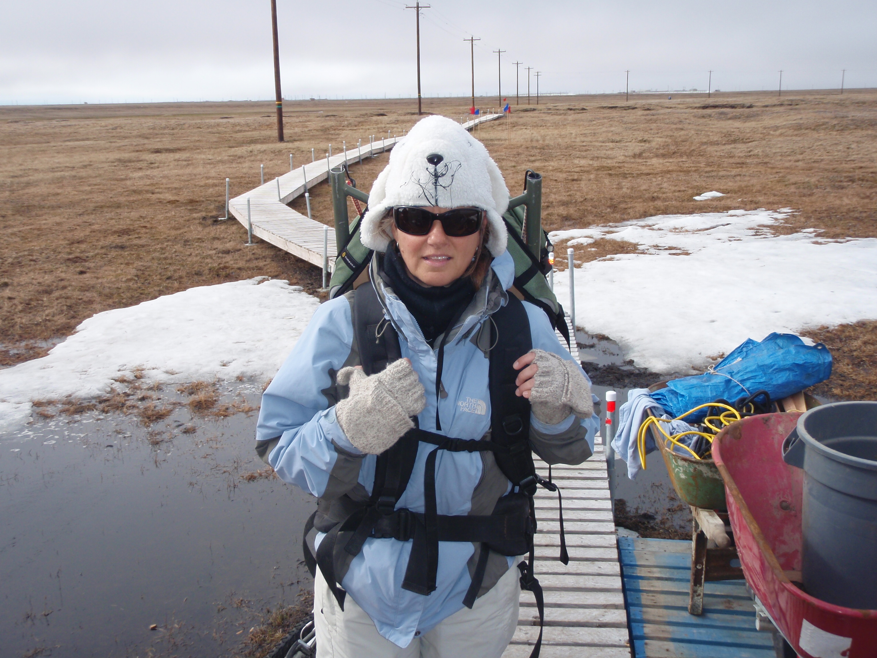 Elizabeth Eubanks made it to the control shed after the 20 minute walk down the tundra paths. She is carrying the infamous $15,000 machine. At the Barrow Environmental Observatory (BEO) field site near Barrow, Alaska.