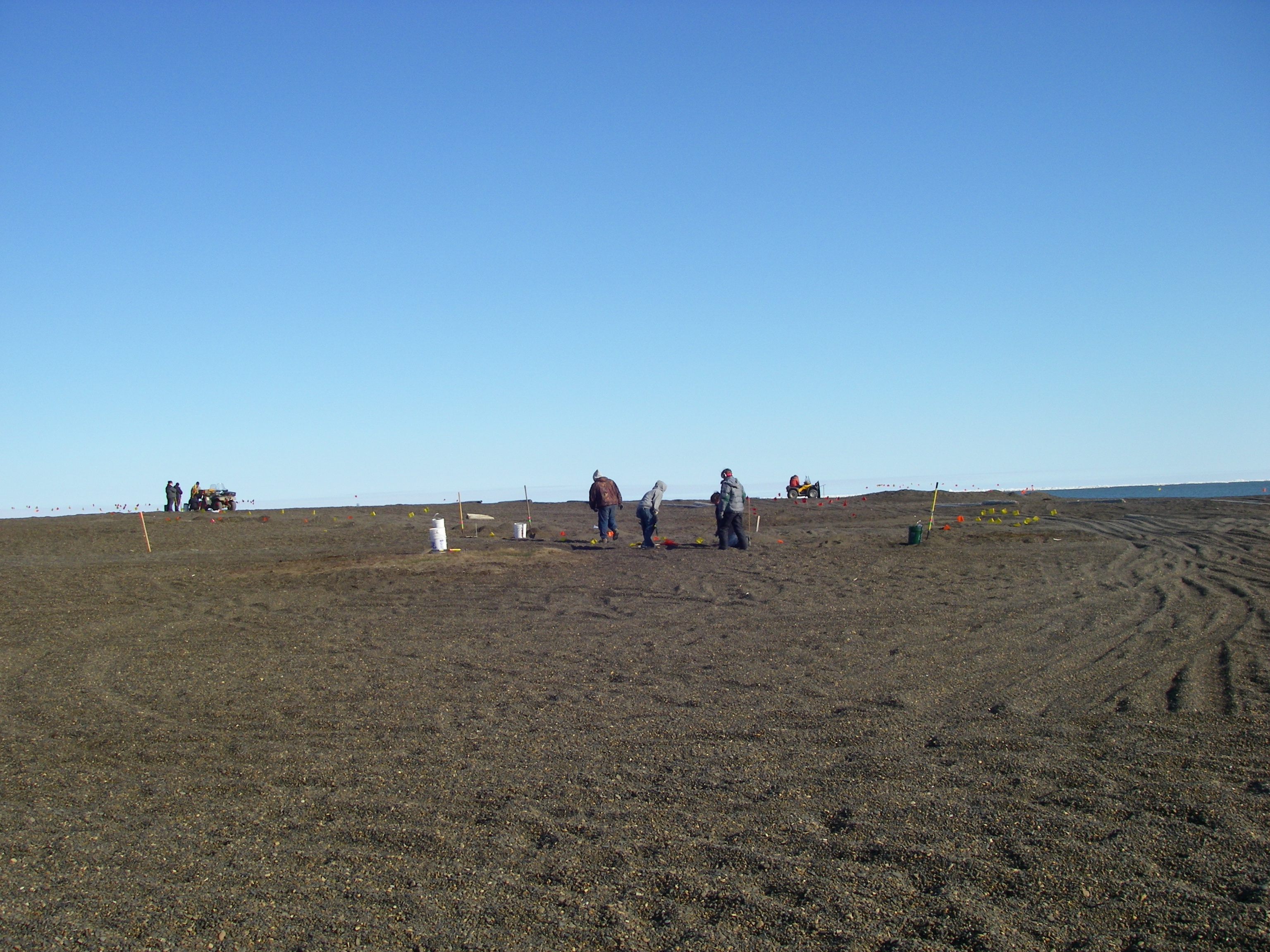 Frank Kelley says, "I have worked in a lot of places but this job site is unique. In the distance, you can see the bear guards who keep us from meeting any of the local polar bears. The archaeologists are working on a site that is probably a midden -- also known as a trash pile." Point Barrow, Alaska.
