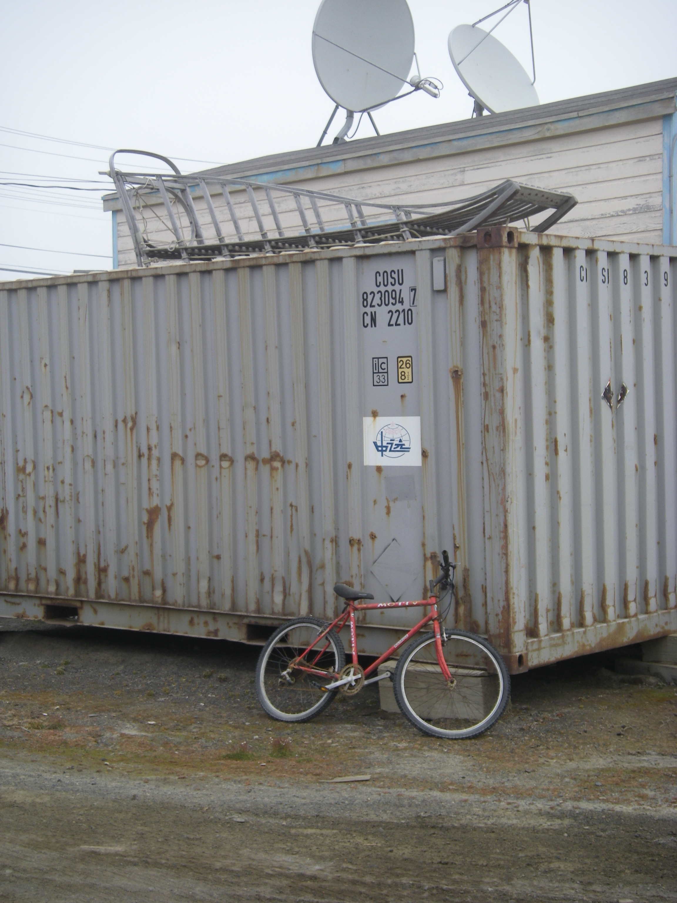 A sled is atop a storage container, while a bike leans against it. Barrow, Alaska.