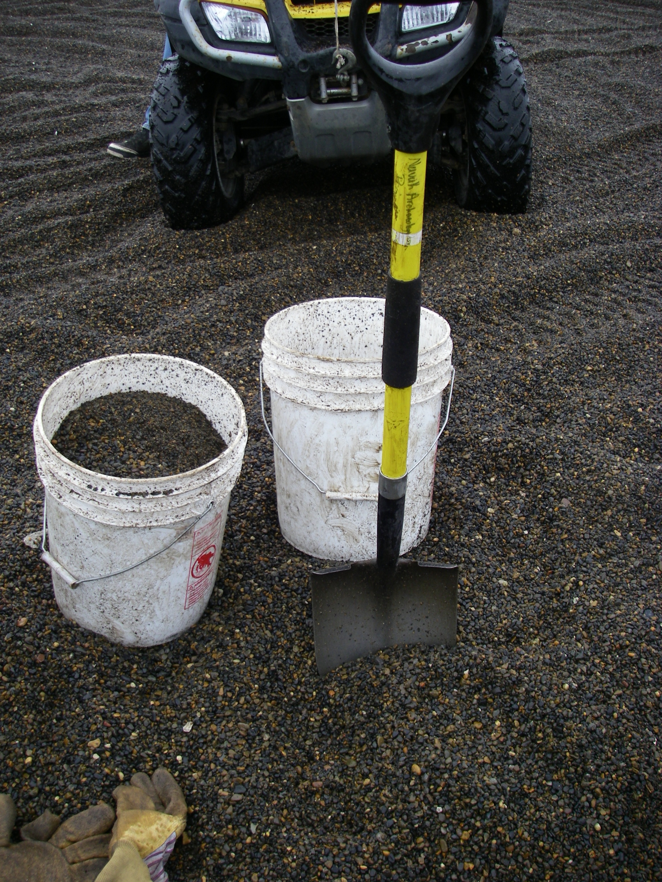 Frank Kelley says, "the buckets and the shovels were all pretty beat up by the end of the day. We had discussions about how much a 5 gallon bucket full of gravel weighs. Might need an experiment to figure that out. Our best guess is around 70lbs." Barrow, Alaska.