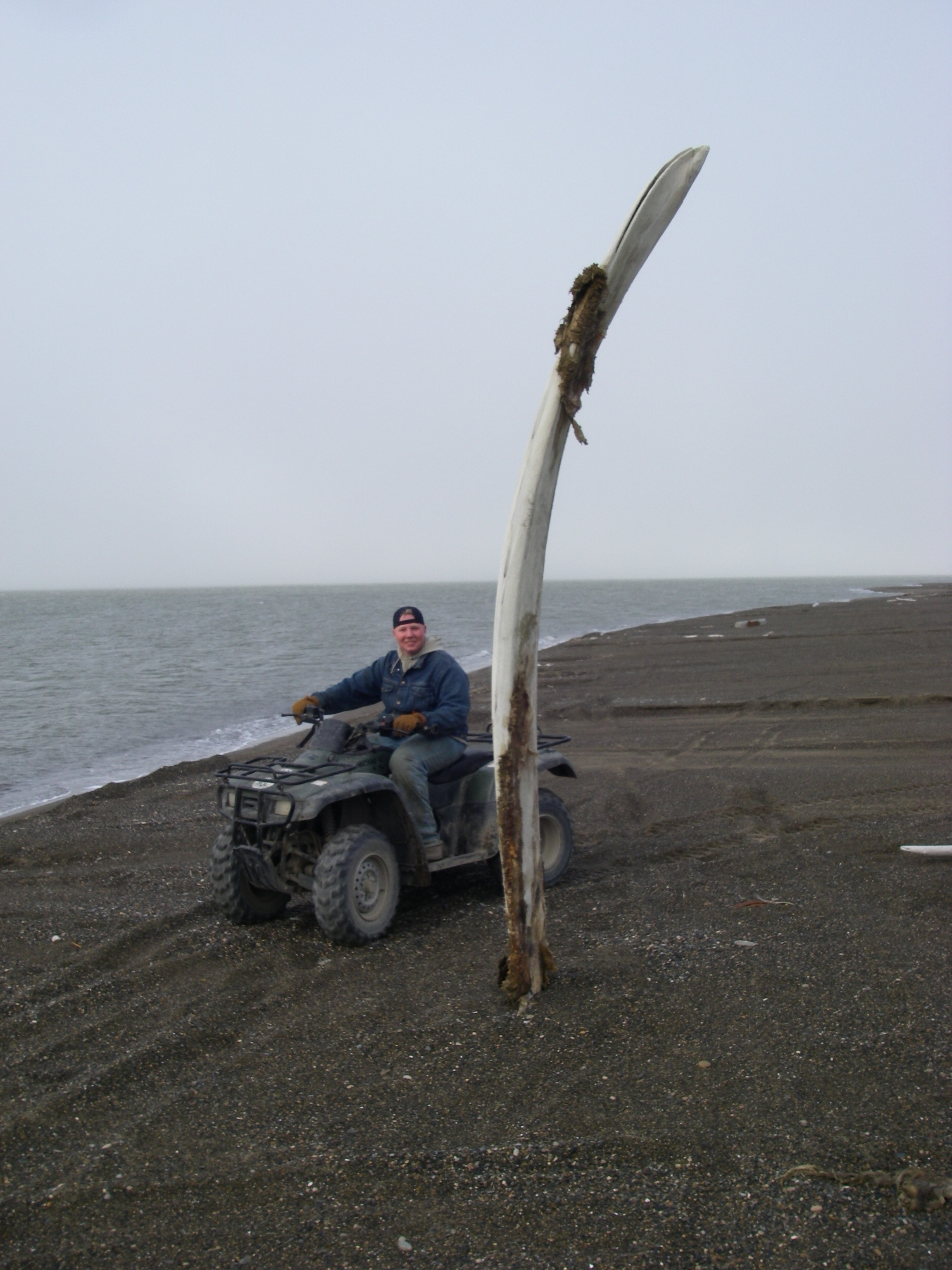 Frank Kelley says, "the size of a whale is difficult to comprehend. Here's a picture of one of the students that is working with us next to a whale rib bone, part of which is stuck into the ground so it stands up. Huge!" Barrow, Alaska.