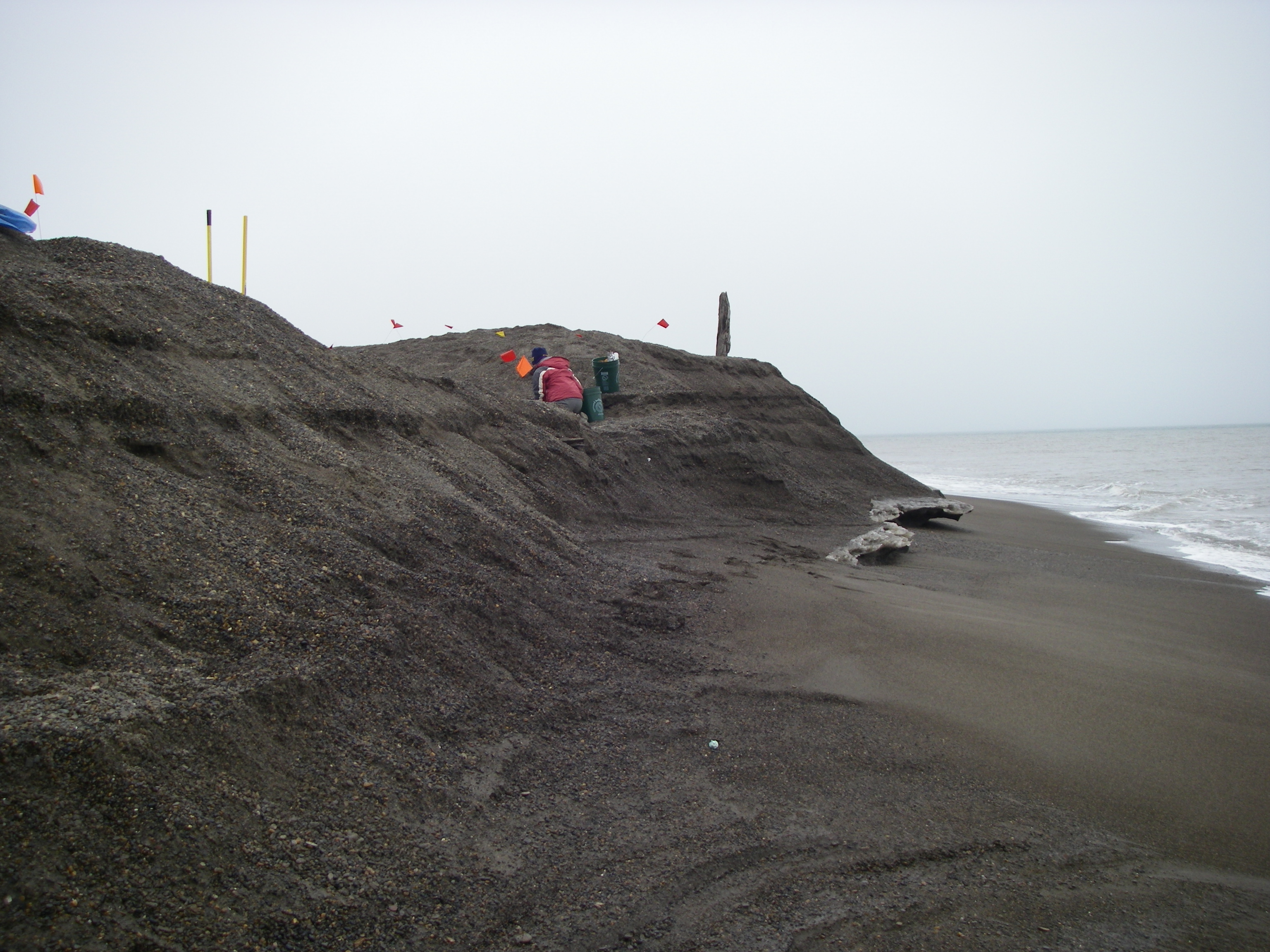 The driftwood feature site has changed significantly due to erosion. Permafrost now pokes out from the bank. Barrow, Alaska.