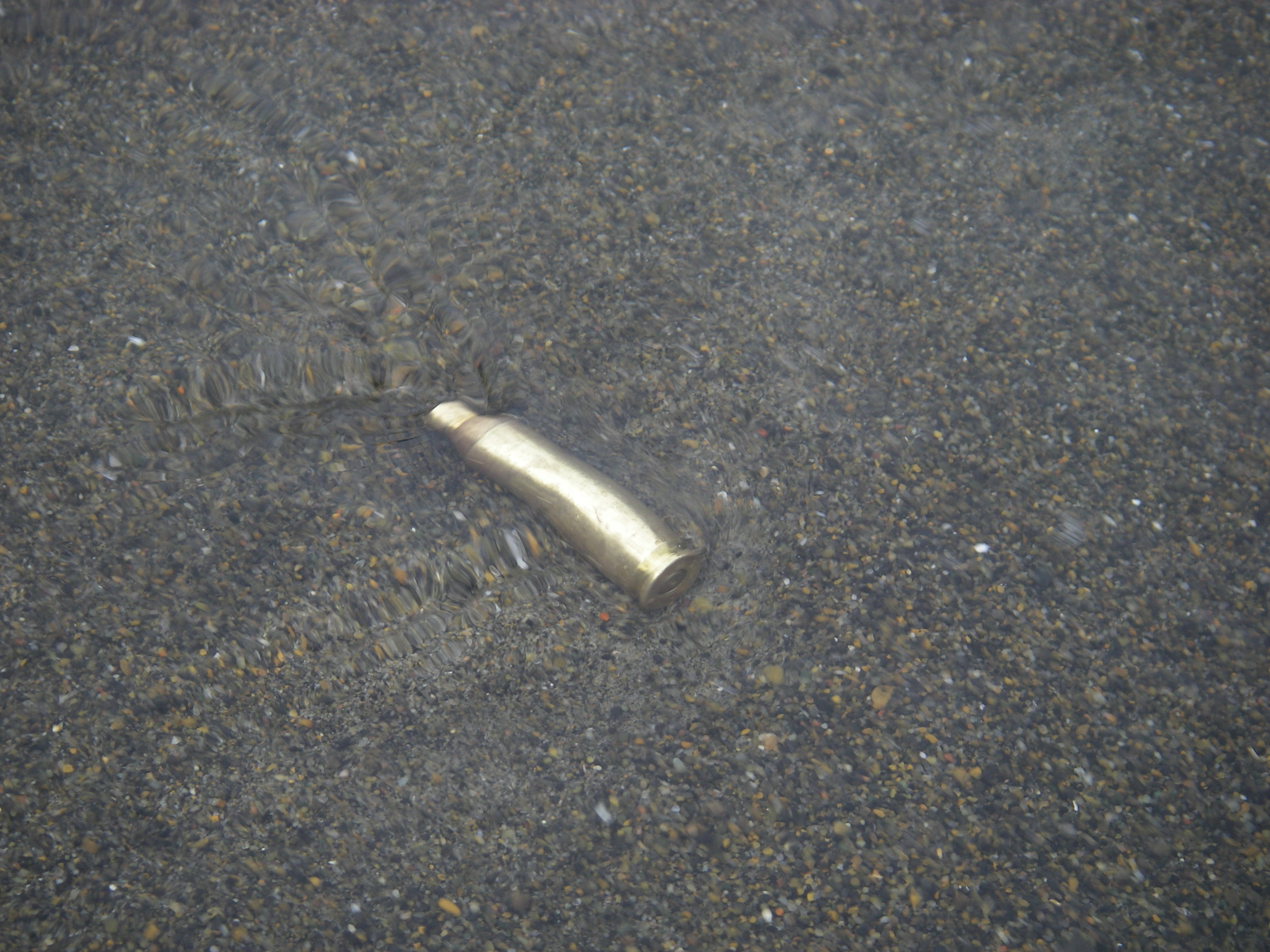 A bullet casing from a rifle. Frank Kelley says, "the native Inupiat people are allowed to subsistence hunt and fish without licenses and without limits. Their typical food system is based on local meat from the ocean and the tundra." Barrow, Alaska.