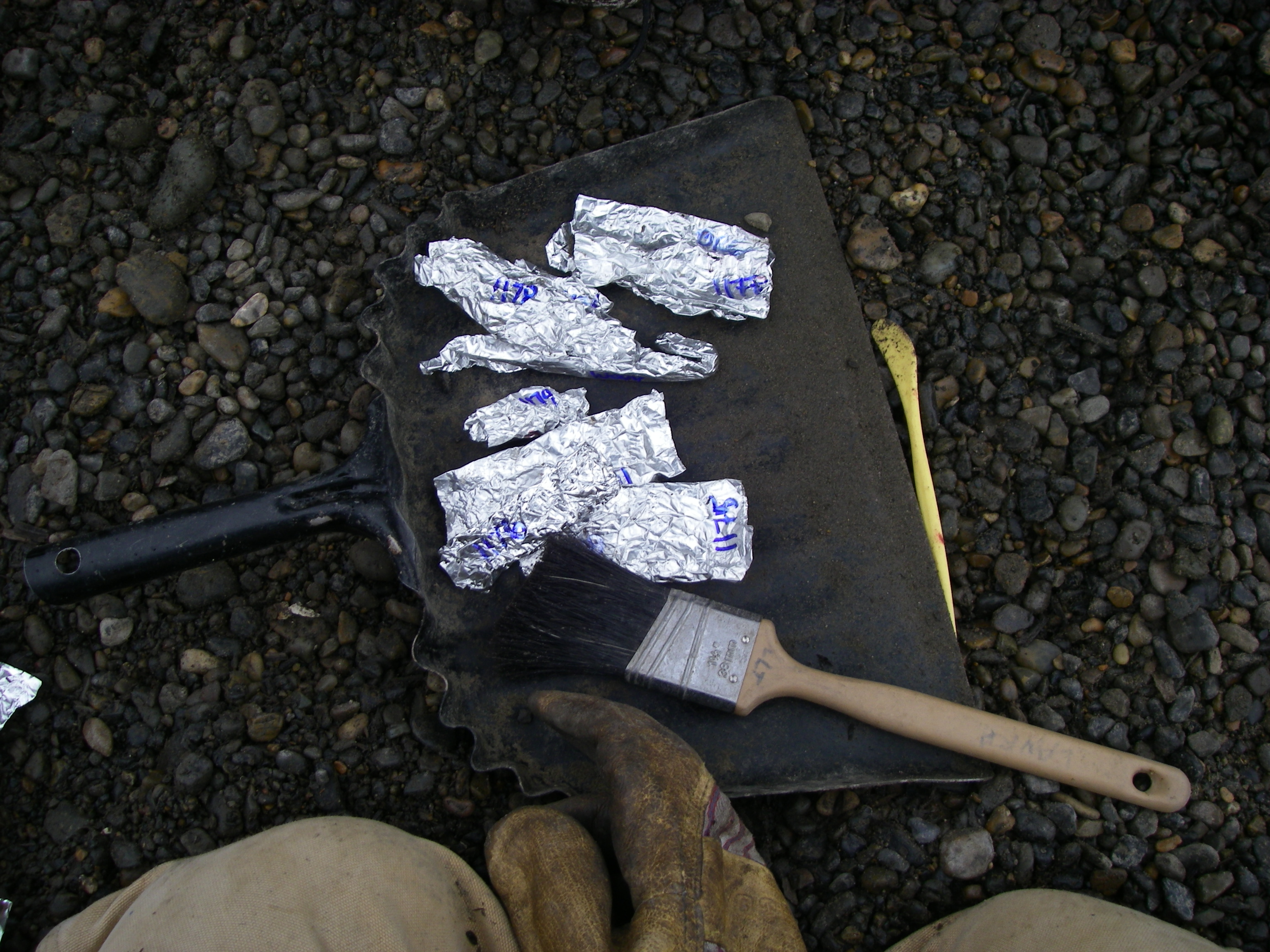 These artifacts have numbers on them that will correspond to the identification number on the ziploc bag. The transit stores the same number. Barrow, Alaska.