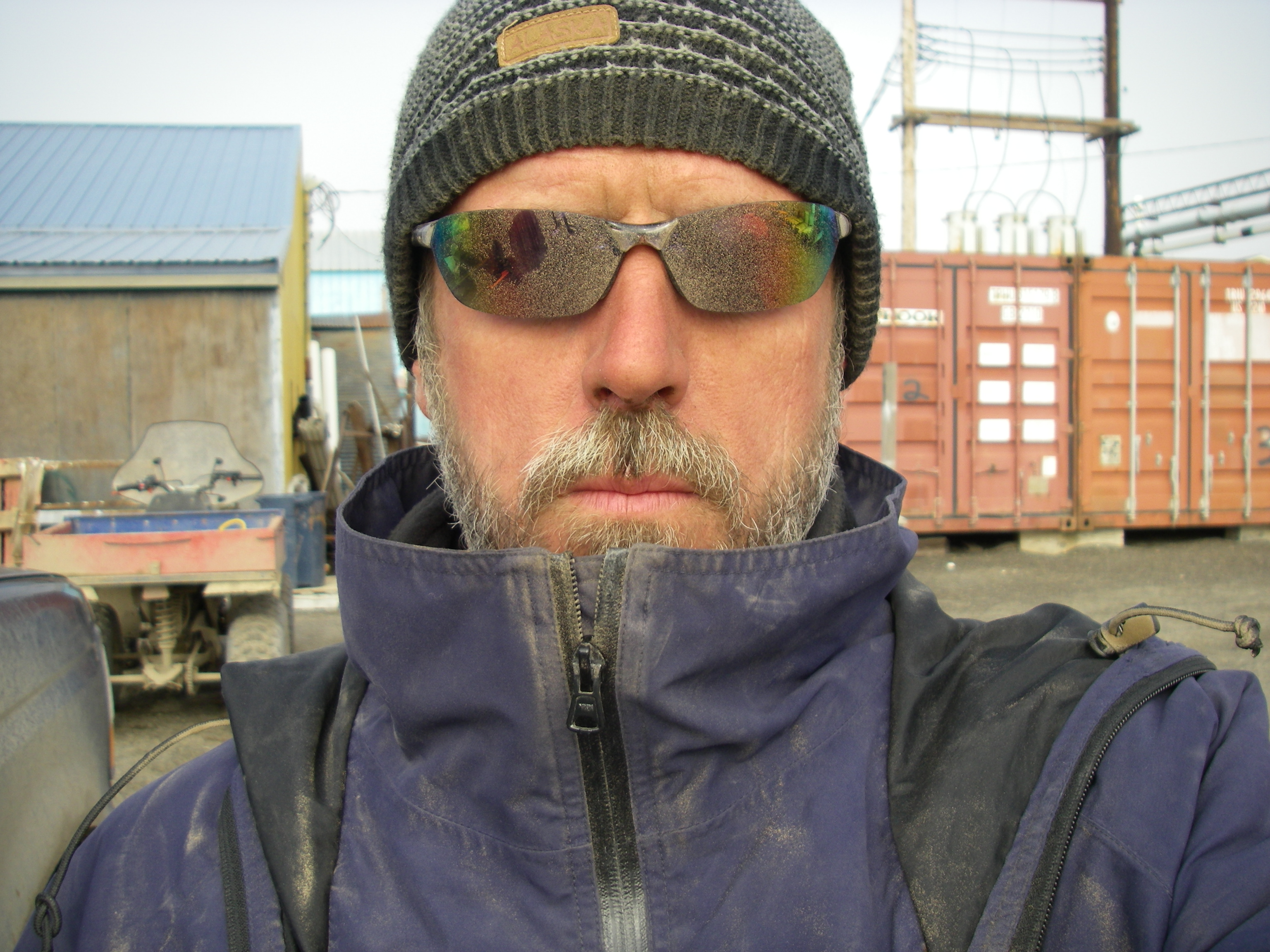 Frank Kelley says, "the ride home is often a challenge. Tired, cold, worn. The commute can be beautiful though. At other times it can be awful. Just what kind of a day today was? Look at the dirt on the glasses, coat, face… Yuck!" Barrow, Alaska.