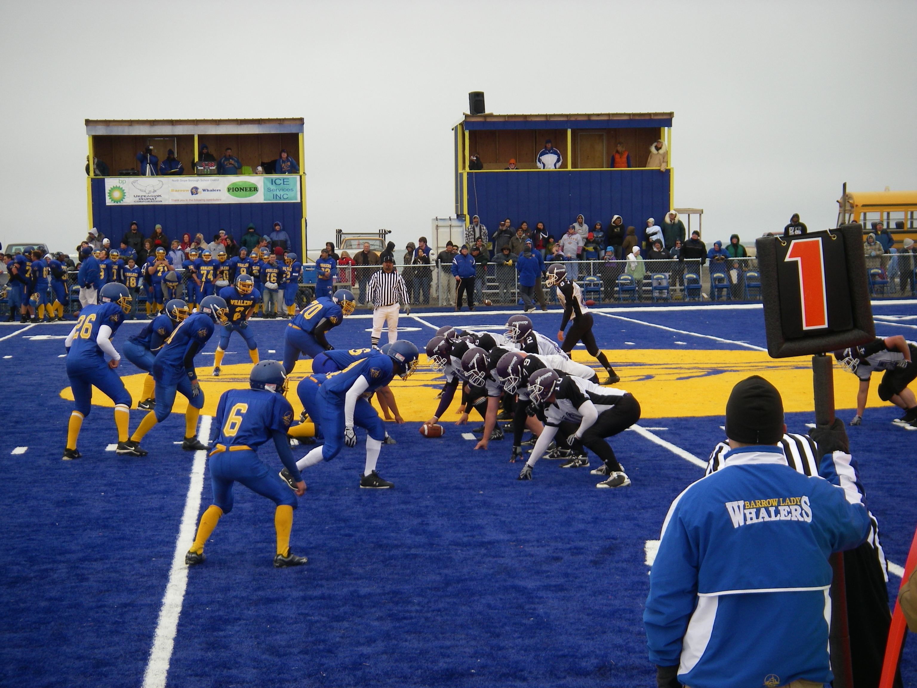 Frank Kelley says, "the blue football field is one of the most colorful parts of Barrow. The players on both sides appreciated the upgrade from a gravel strewn 'field.'" Barrow, Alaska.