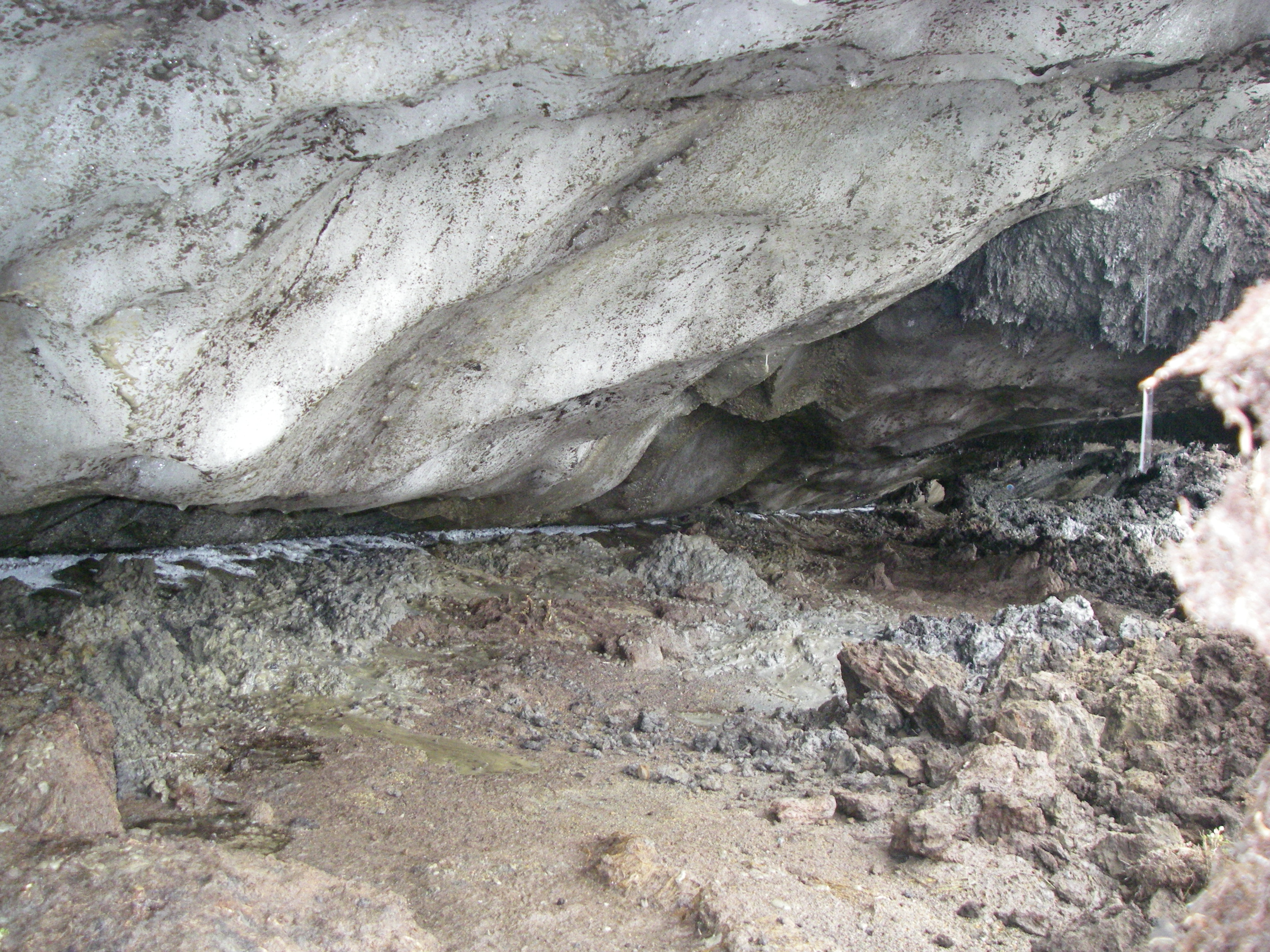 An ice wedge forms as water freezes further and further down into the ground. Cracks open on the top of the surface, especially during the summer, more water seeps in, freezes, and causes the wedge to push out further. In this photo, you can see the dirty ice in the top half of the photo. There is a thin line of white frost where the ice meets the soil. Barrow, Alaska.