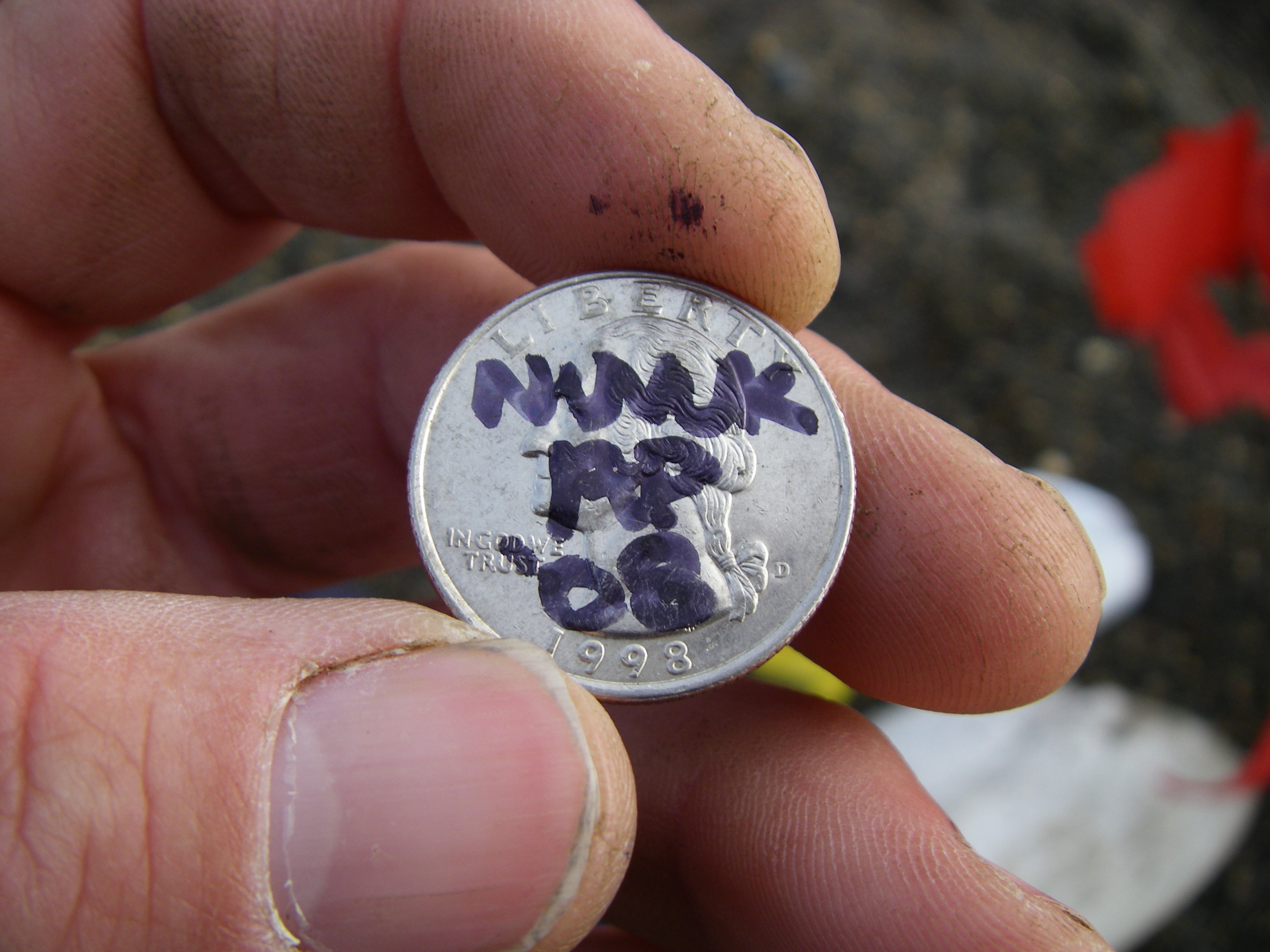 Frank Kelley says, "we put this coin in the fox den feature to see if the excavators next year find it. It should be pretty easy, and hopefully comical." Barrow, Alaska.