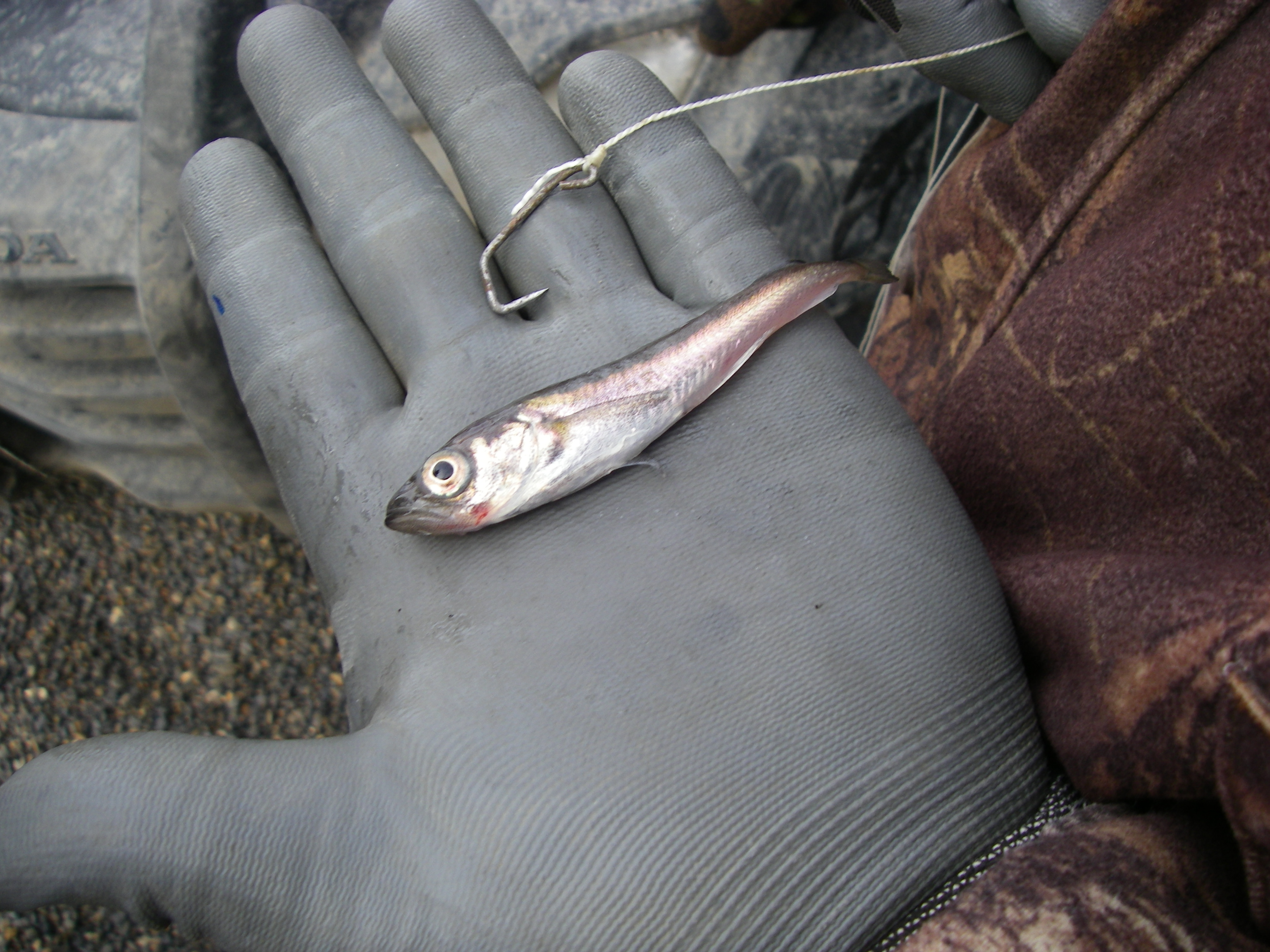 Frank Kelley says, "Kyle noticed all these little tomcods in the water. He quickly made a fish hook out of one of the pin flags, sharpened it to a point and went off fishing. The results are in hand." Barrow, Alaska.