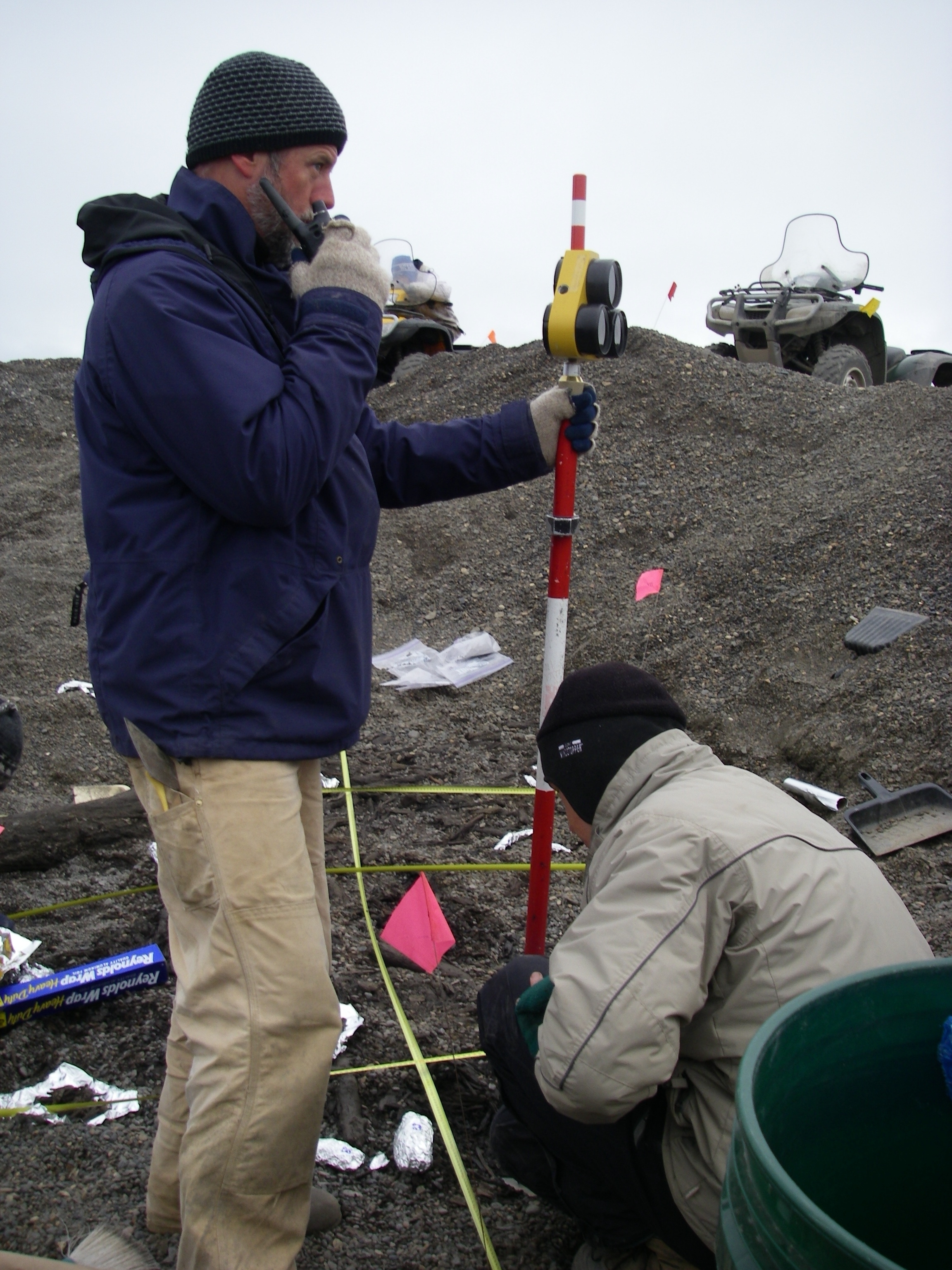 Frank works the stadia rod in the middle of the driftwood feature. Barrow, Alaska.