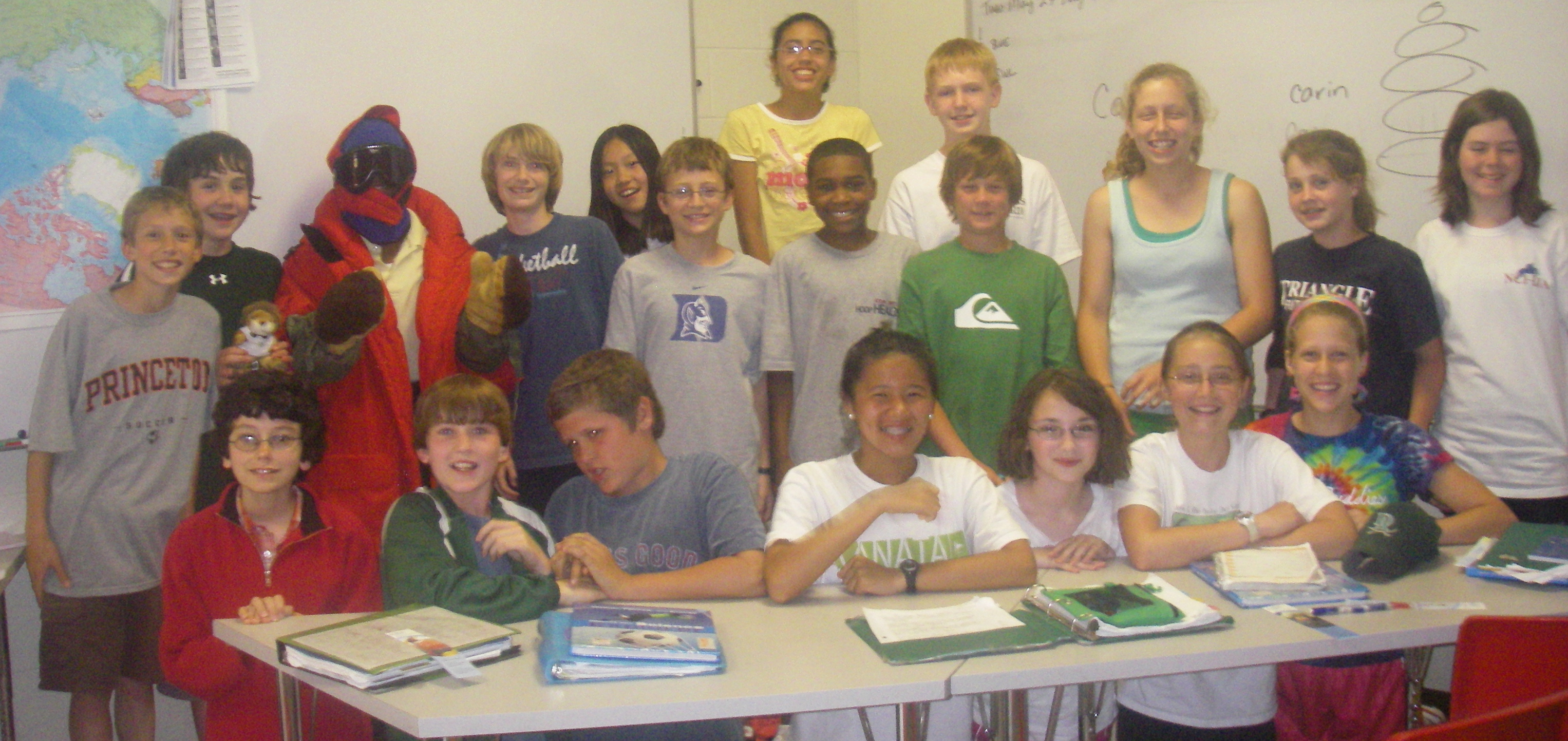 Mrs. Ward's Sci6W class with Cavaleo the lion. Mrs. Ward's classroom, Durham Academy Middle School, Durham, North Carolina.