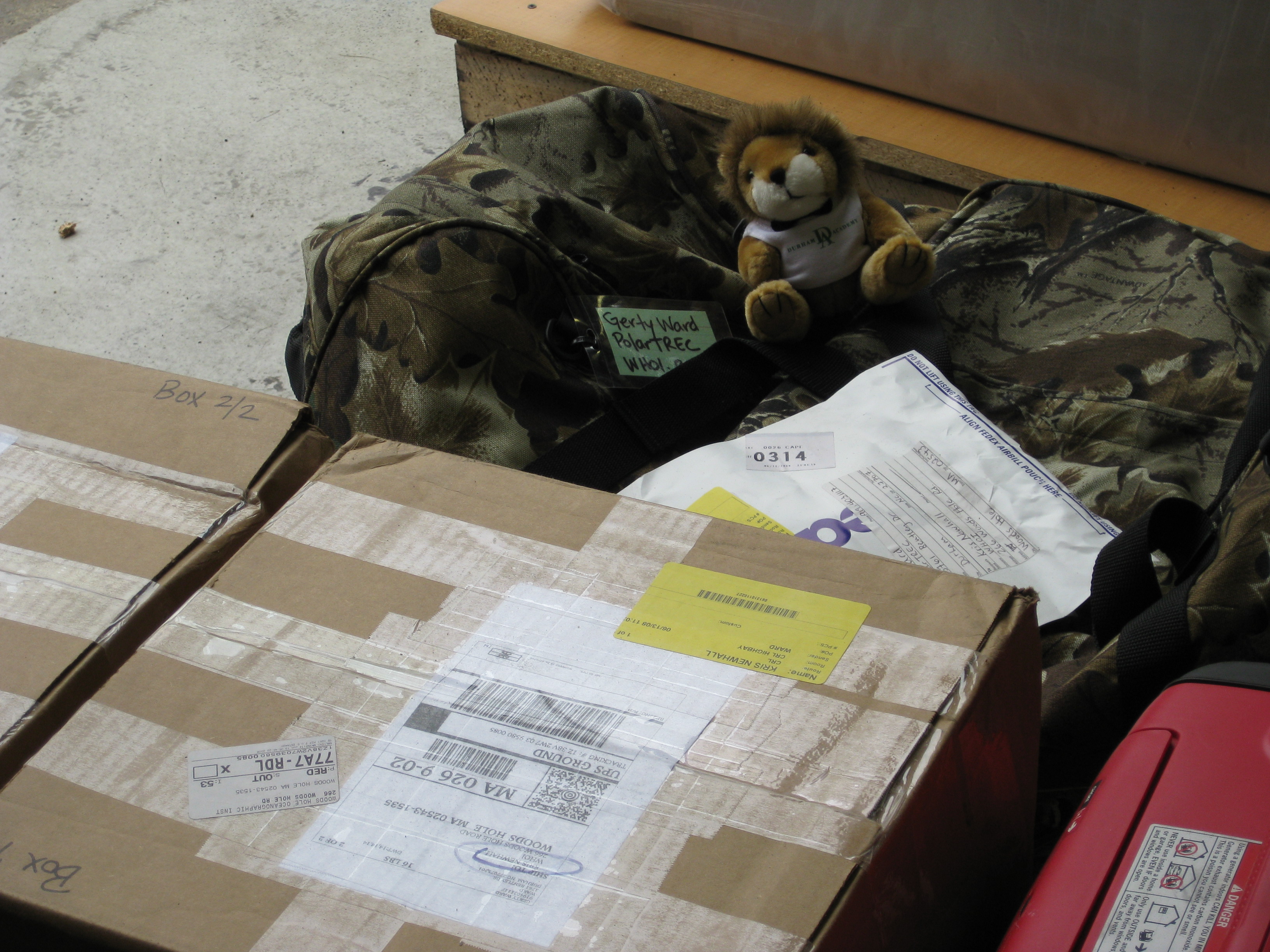 Cavaleo the lion sits among Gerty Ward's gear that was shipped to Woods Hole Oceanographic Institution (WHOI) to be placed onto the ship prior to her arrival. Woods Hole, Massachusetts.