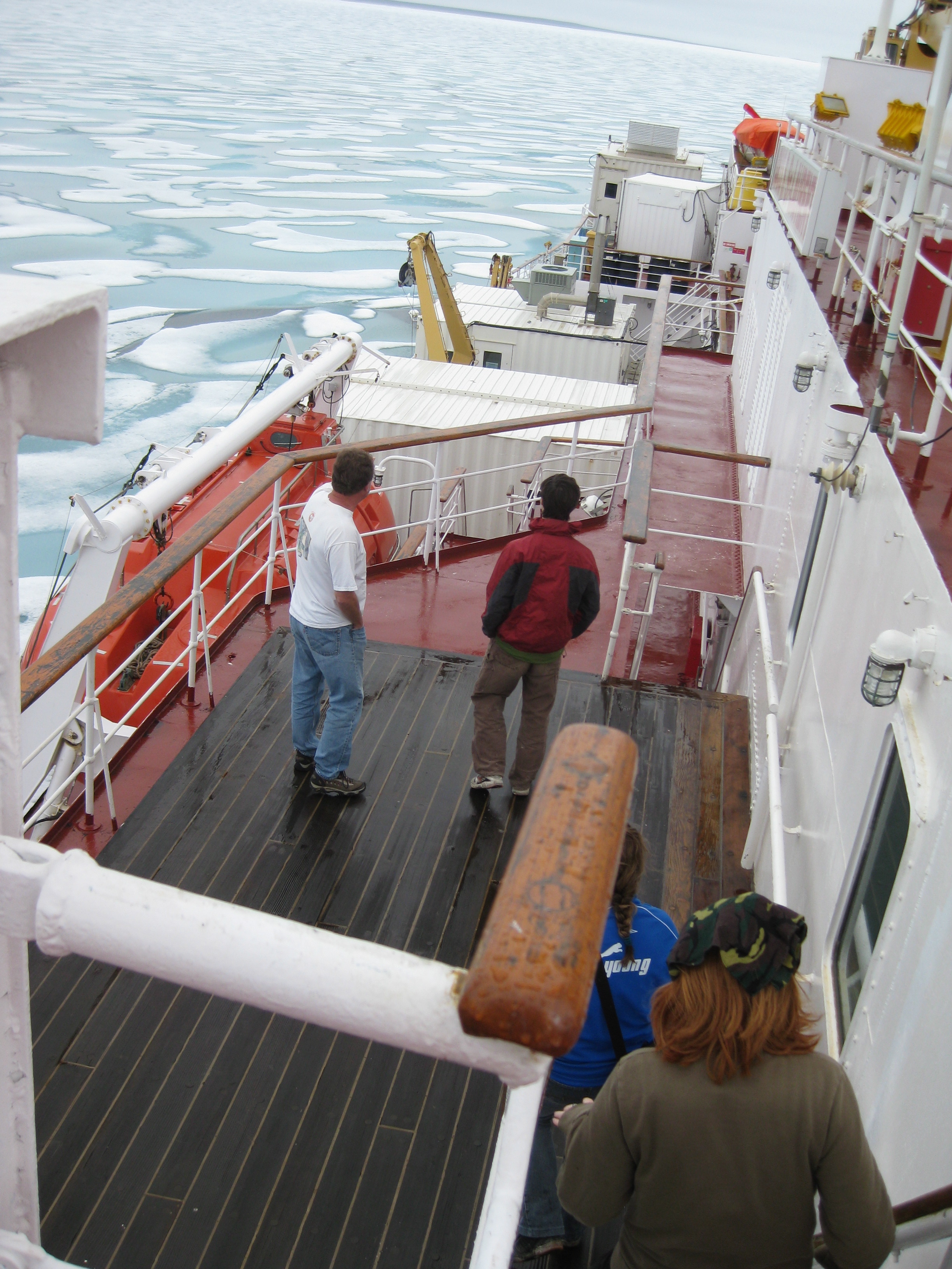 Rick Krishfield gives a boat tour. Here he descends from the bridge on the starboard side. Aboard the Canadian Coast Guard icebreaker Louis S. St-Laurent, on the Beaufort Sea.