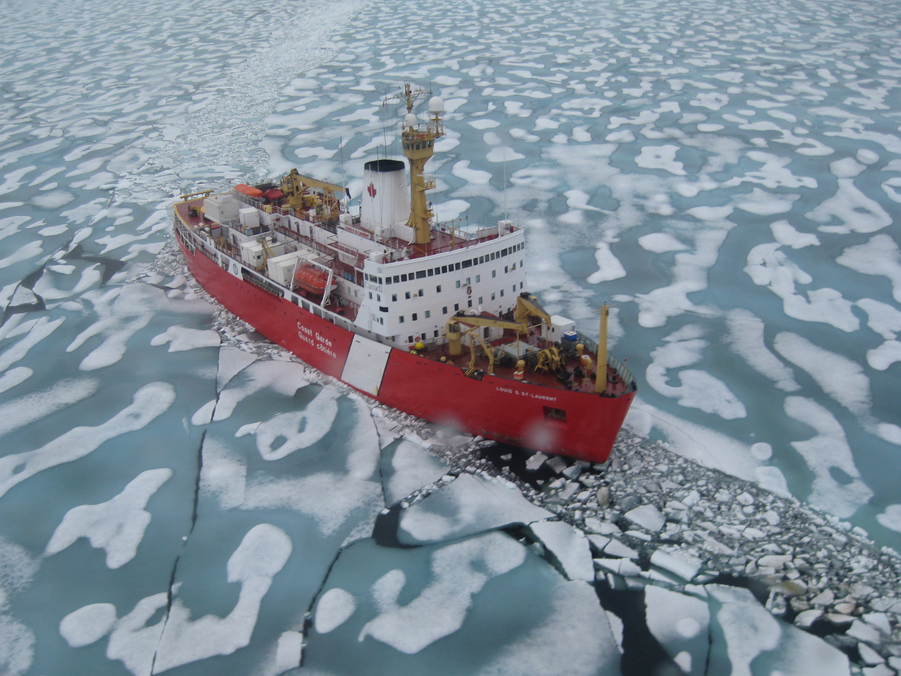 A view from the helicopter of the Louis S. St-Laurent in Cambridge Bay, Nunavut, Canada.