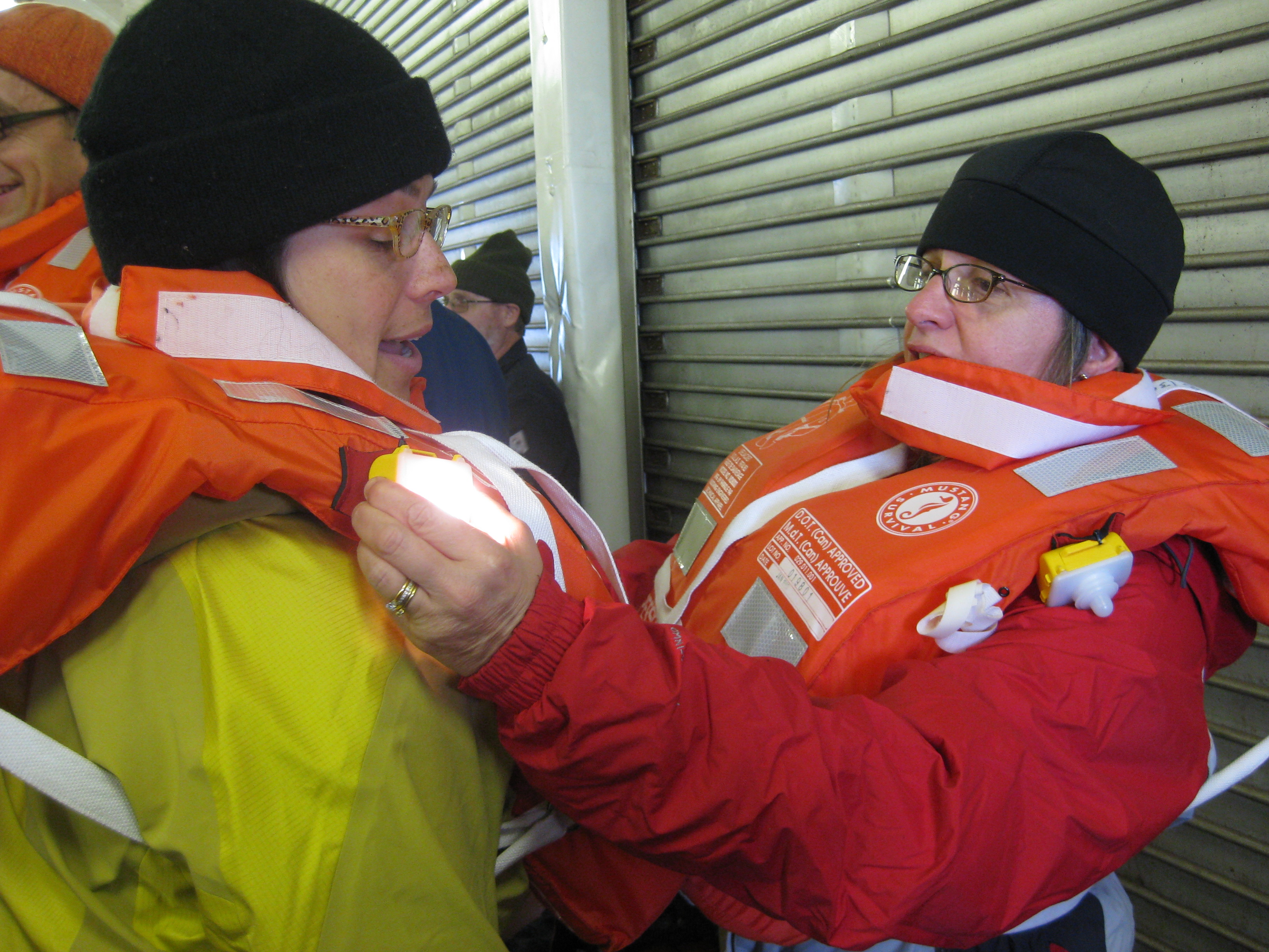Gerty Ward checks the water activated light on Alice Orlich's life vest. They are dressed for the extreme cold, even for a drill. Aboard the Canadian Coast Guard icebreaker Louis S. St-Laurent, on the Beaufort Sea.
