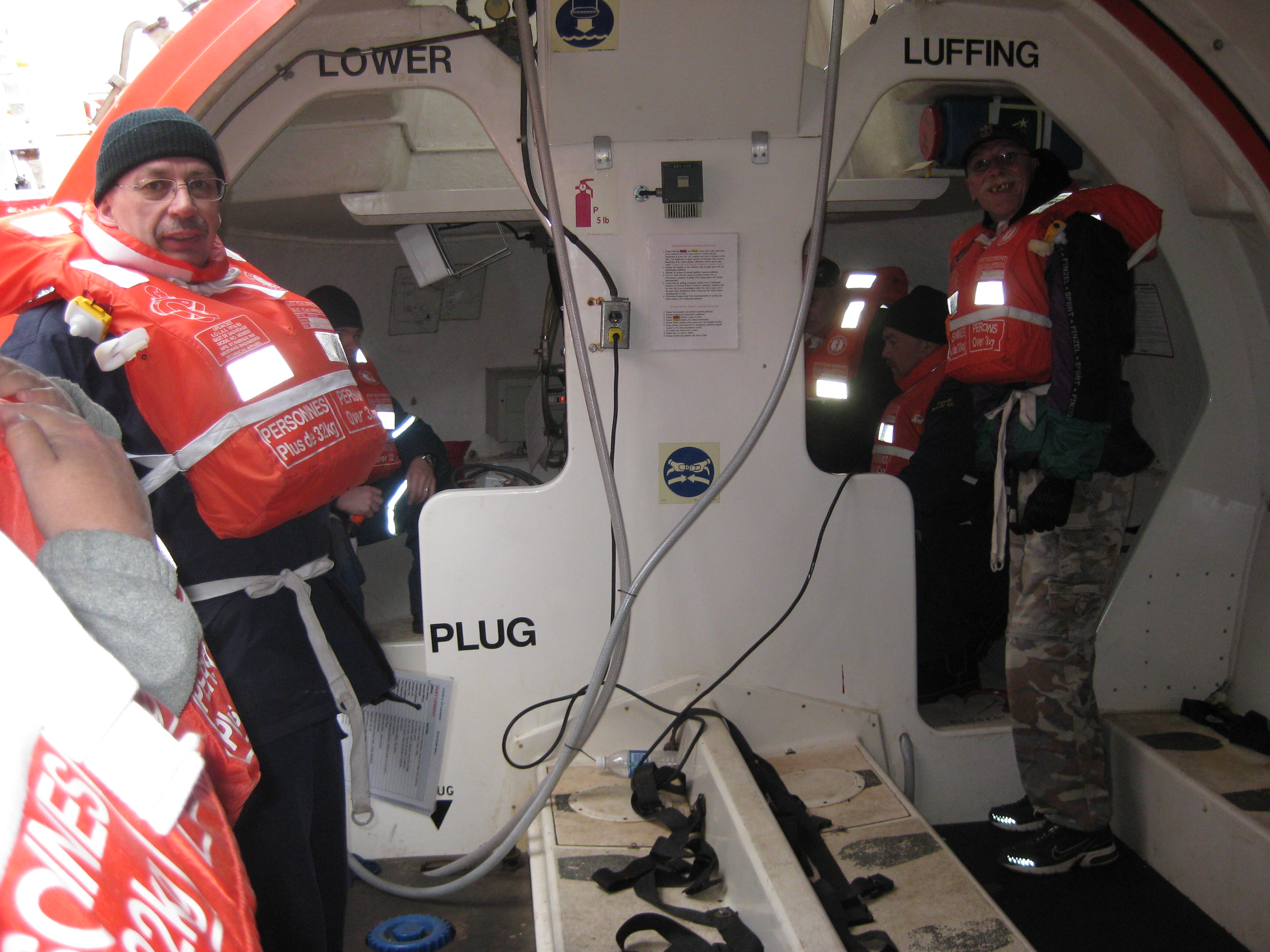 Gerty Ward says, "we checked out the inside of the life boat, while Chief Officer Nunn explained its features." Aboard the Canadian Coast Guard icebreaker Louis S. St-Laurent, on the Beaufort Sea.