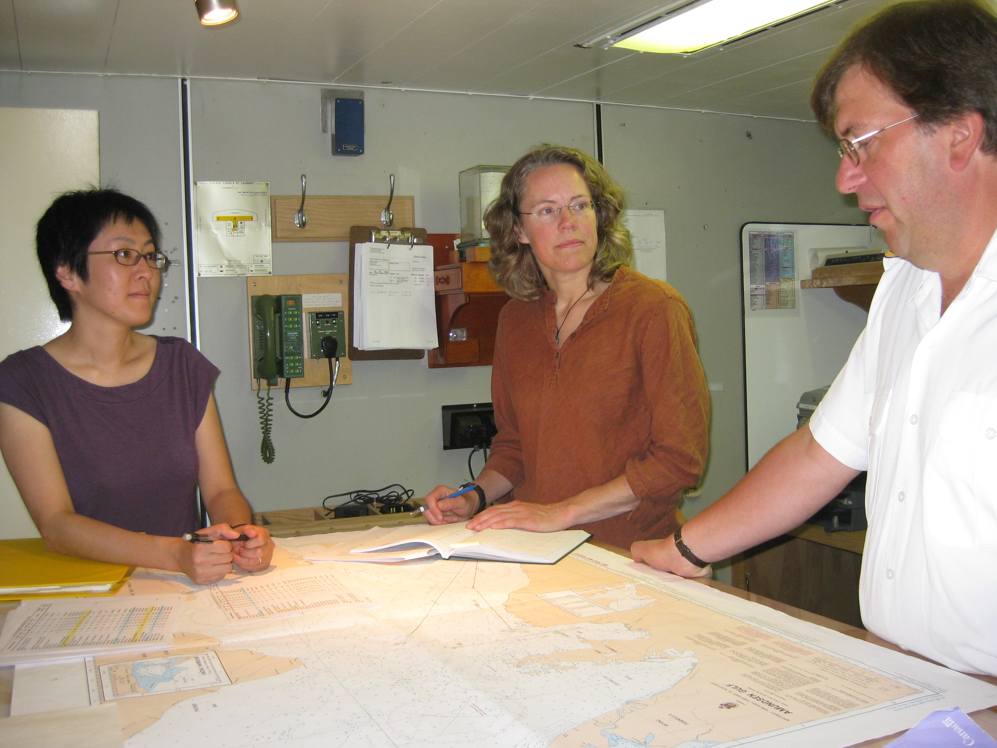 Captain McNeil confers with Chief Scientists Sarah Zimmerman and Michiyo Kawai. Aboard the Canadian Coast Guard icebreaker Louis S. St-Laurent, on the Beaufort Sea.