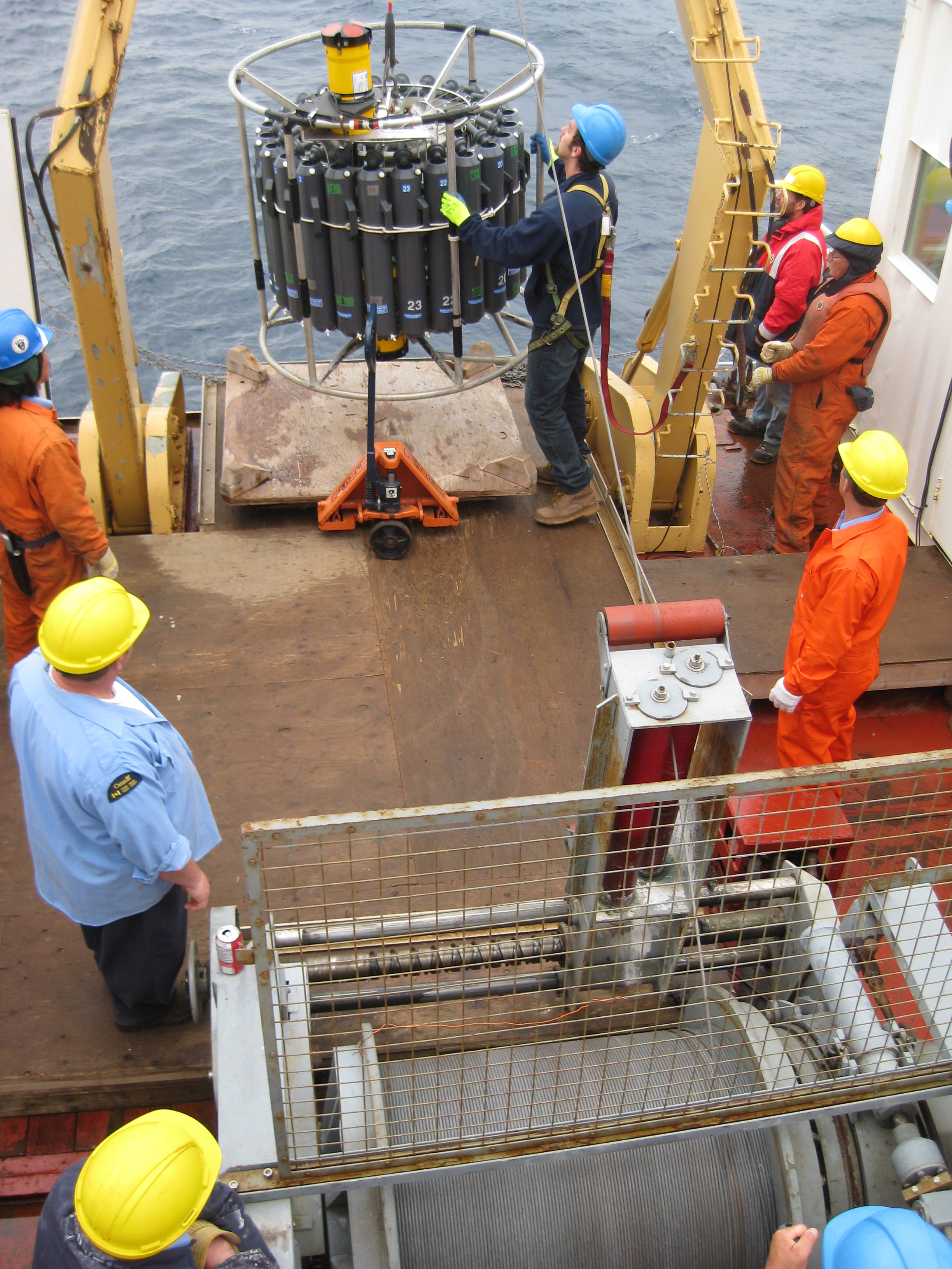 After receiving permission from the bridge, the Rosette is lowered into the water. Aboard the Canadian Coast Guard icebreaker Louis S. St-Laurent, on the Beaufort Sea.