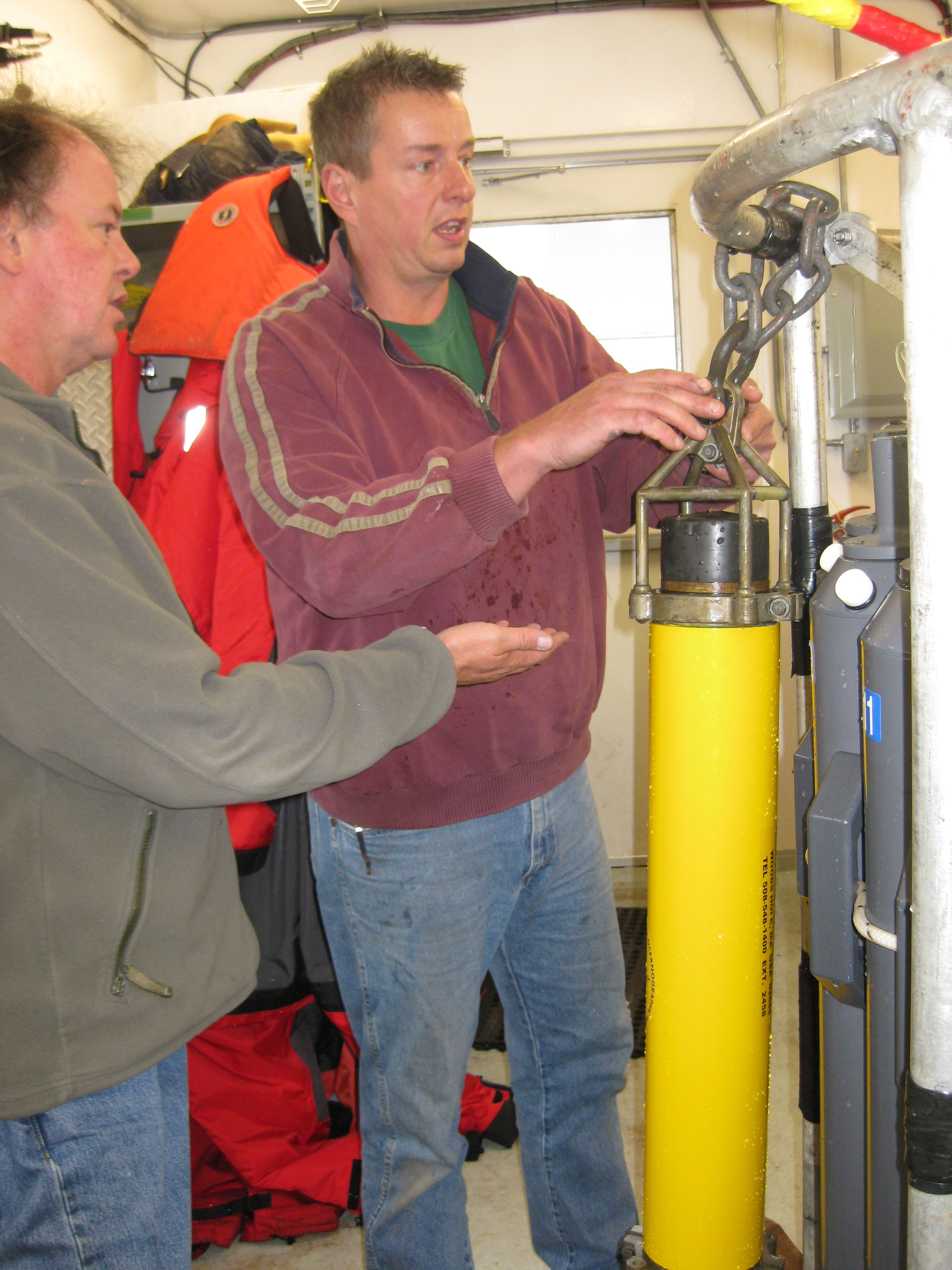 Hugh Maclean (left) helps Jim Dunn remove an acoustic release mechanism from the rosette. Jim sent the mechanism down to 2000 meters to be sure that it was working correctly. Aboard the Canadian Coast Guard icebreaker Louis S. St-Laurent, on the Beaufort Sea.