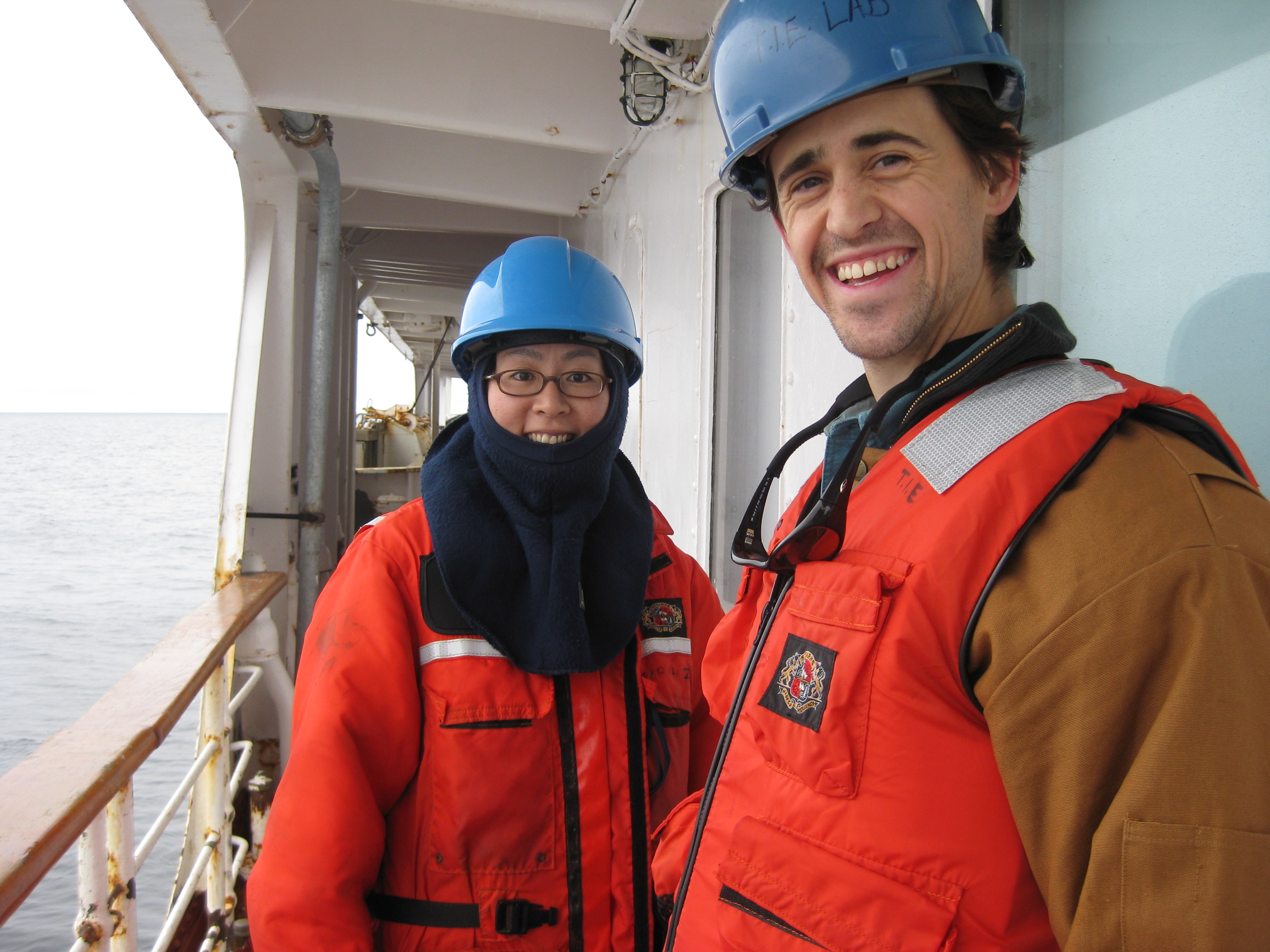 Michiyo Kawai and Dave Griffith back on board the LSSL after being out in the zodiac boat. Aboard the Canadian Coast Guard icebreaker Louis S. St-Laurent, on the Beaufort Sea.