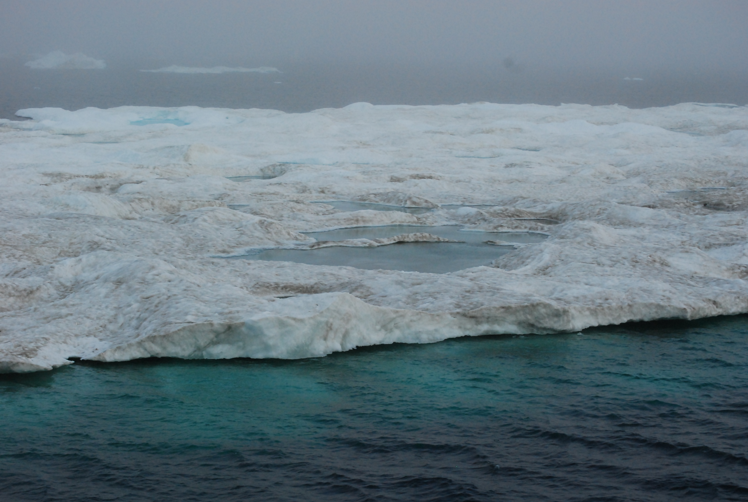 Gerty Ward says, "we are sailing south, yet seeing more ice. One theory is that we are seeing chunks of land-fast ice that has broken free and is being blown by the wind. Note the dirt. It may have come on the ice from the land via wind and erosion." Aboard the Canadian Coast Guard icebreaker Louis S. St-Laurent, on the Beaufort Sea.