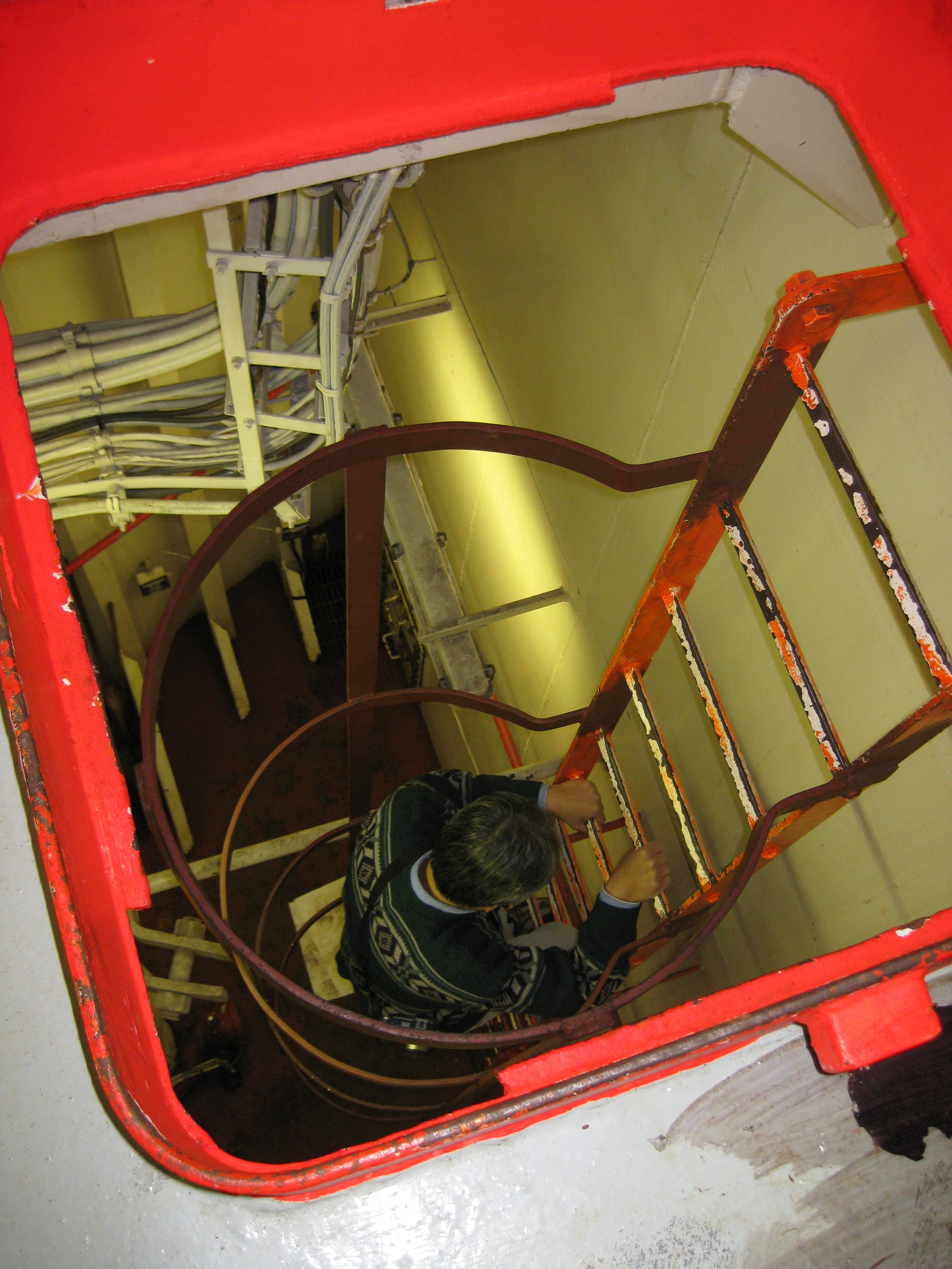 Gerty Ward says, "this is the ladder to the bubbler motor. The ship was rolling quite a bit so I decided not to go down. Edmand went. Ships are inherently dangerous places, so for your safety you should know and respect your limits." In the engine room, aboard the Canadian Coast Guard icebreaker Louis S. St-Laurent, on the Beaufort Sea.