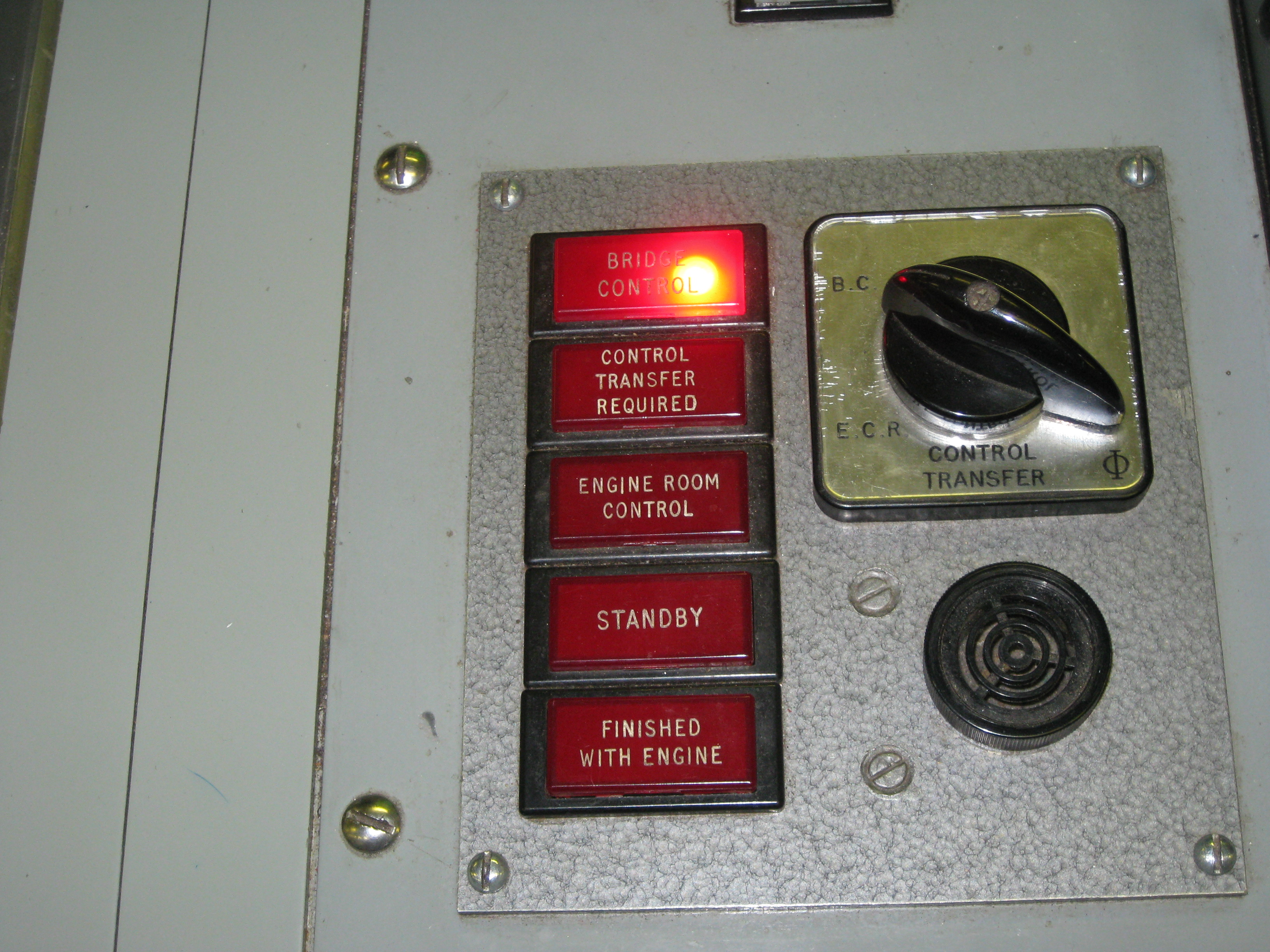 This switch transfers the control of the engines from the engine room to the bridge. In the engine room, aboard the Canadian Coast Guard icebreaker Louis S. St-Laurent, on the Beaufort Sea.